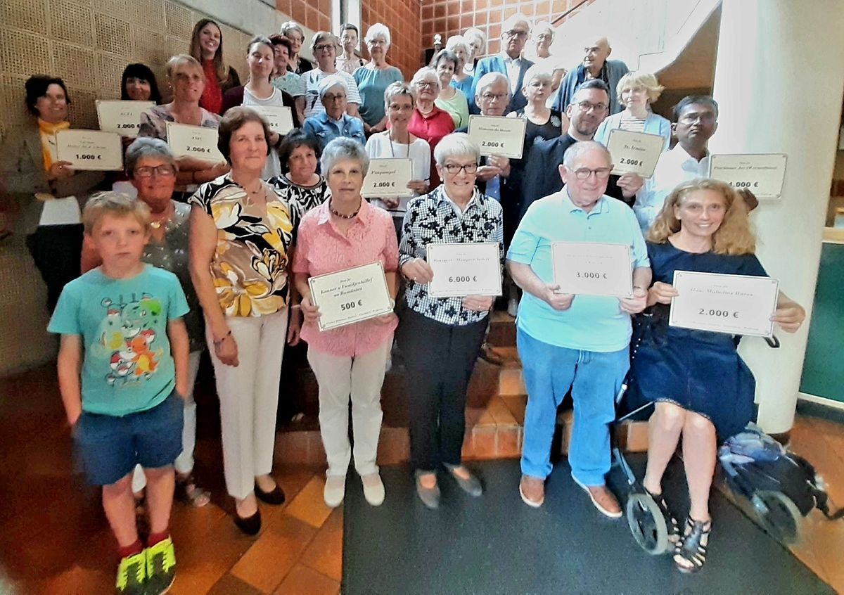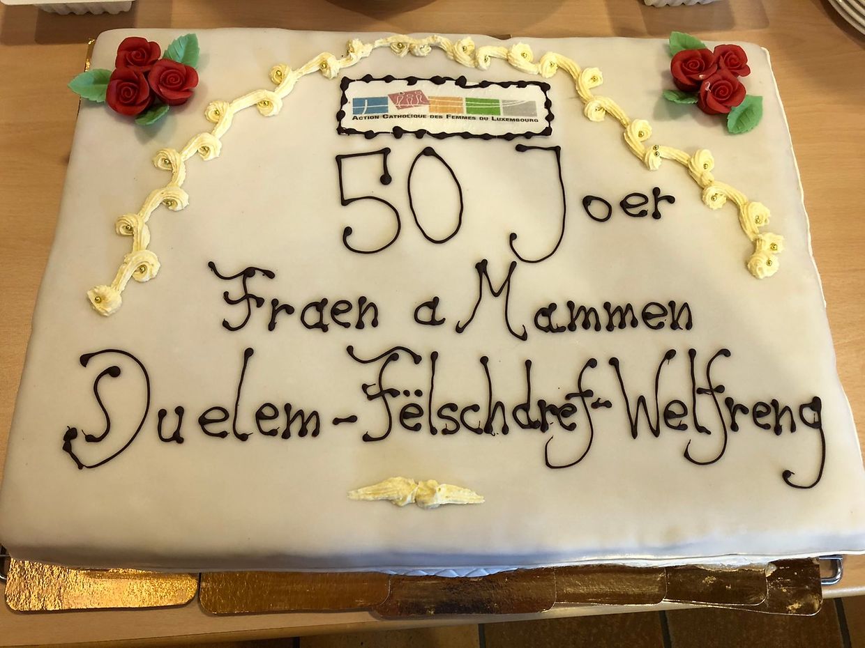 Die Presidentin der "Fraen an Mammen" von Dalheim-Filsdorf-Welfringen, Marie-Thérèse Thill-Schandeler konnte unter den vielen Anwesenden: die Verantwortlichen der Gemeindeverwaltung, Anette Tausch in der Vertretung der Nationalpresidentin der ACFL, den Pfarrer Santhanam Jeyaraj sowie eine große Anzahl Mitglieder begrüßen. Ebenfalls waren geladen die Verantwortlichen der zwölf Vereinigungen zur Entgegennahme der Spenden. Als Hauptzweck der Zusammenkunft teilte die Presidentin mit, dass die "Fraen an Mammen" beschlossen haben ihre Tätigkeiten nach 50 Jahren zu beenden. Zwölf Vereinigungen waren dazu eingeladen, um den verbleibenden Kassenbestand in Empfang zu nehmen. Dies waren: Rousport-Mompech hëlleft 6000€, Pfarrer Santhanam Jeyaraj 4000€, Oeuvres Paroissiales 3000€, ALAN (Maladies rares) 2000€, Leederwon 2000€, Pimpampel 2000€, ACFL 2000€, St Irmine 2000€, AMU 2000€, Médecin du Monde 2000€, Hëllef fir Ukrain (Caritas) 1000€, Kanner an Familjenhëllef an Rumänien 500€. Der letzte Dank ging an die Komiteemitglieder: Françine Greischer, Marie-Louise Beissel, Irène Vandivinit, Germaine Welter und José Vandivinit. Im Anschluss lud die Gemeinde zu einem Ehrenwein ein und die "Fraen an Mammen" aus Anlass des 50 jährigen Jubiläums zu einem Stück Geburtstagskuchen.