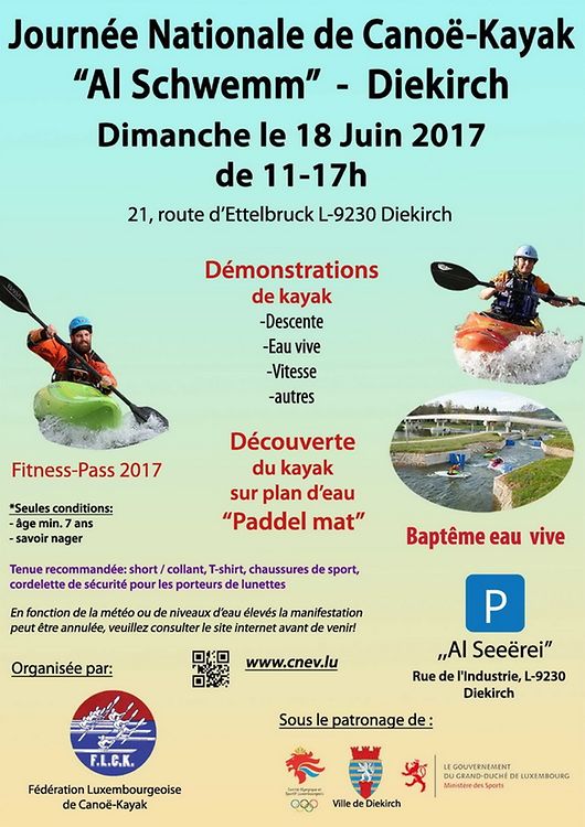 FrançaisVous voulez découvrir différentes disciplines de Kayak, sur eau calme et eau vive? Alors venez assister aux démonstrations le long de cette journée et essayez vous-mêmes : Des petites séances d'initiation vous donneront la possibilité de découvrir la navigation en kayak et canoë sur eau calme et des kayakistes expérimentés peuvent vous proposer un baptême eau vive en kayak biplace. Davantage d'informations sur les sites internet "www.cnev.lu" et "www.flck.lu".