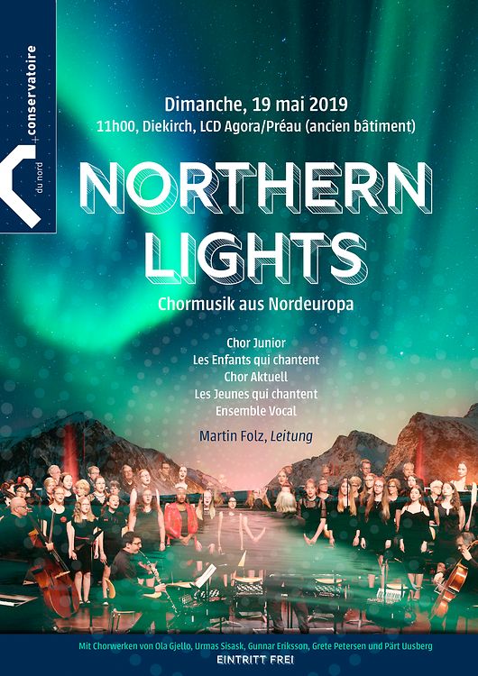 Im Mittelpunkt des Konzerts steht Chormusik aus Nordeuropa - Schweden, Finnland, Estland, Lettland.... “Northern Lights” ist aber auch ein Bild für die jungen Künstler des Conservatoire, die den Norden Luxemburgs symbolisieren sollen.