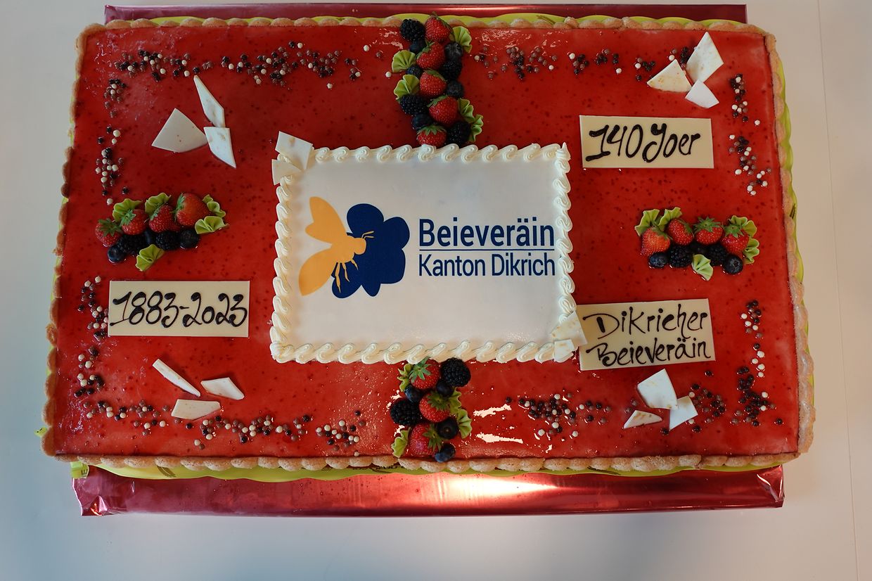 Nach dem sich anschließenden Mittagsessen wurde der 140. Geburtstag des Diekircher Kantonalimkervereins mit einem Kuchen gefeiert. Der Präsident des Diekircher Vereins Jerry Groeff skizzierte kurz die Geschichte des Imkervereins Diekirch und erinnerte daran, dass der Verein 1883 vom Professor Kunnen in der Ackerbauschule in Ettelbruck gegründet wurde. Hier begrüßten wir auch zwei Vertreter der ASTA: die Herren Weyland und Koerner