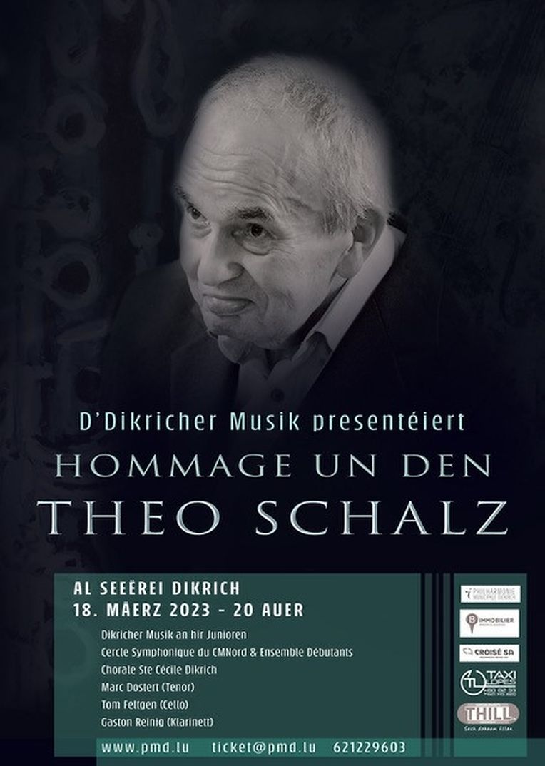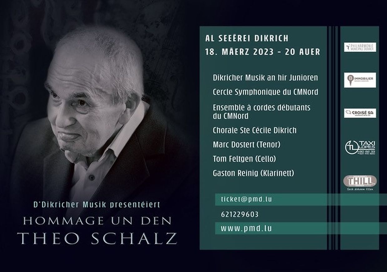 Concert en hommage à Théo Schalz organisé par la Philharmonie Municipale de Diekirch avec la participation de la Chorale Sainte Cécile Diekirch, du Cercle Symphonique du Conservatoire de Musique du Nord et les solistes Marc Dostert, Gaston Reinig & Tom Feltgen.