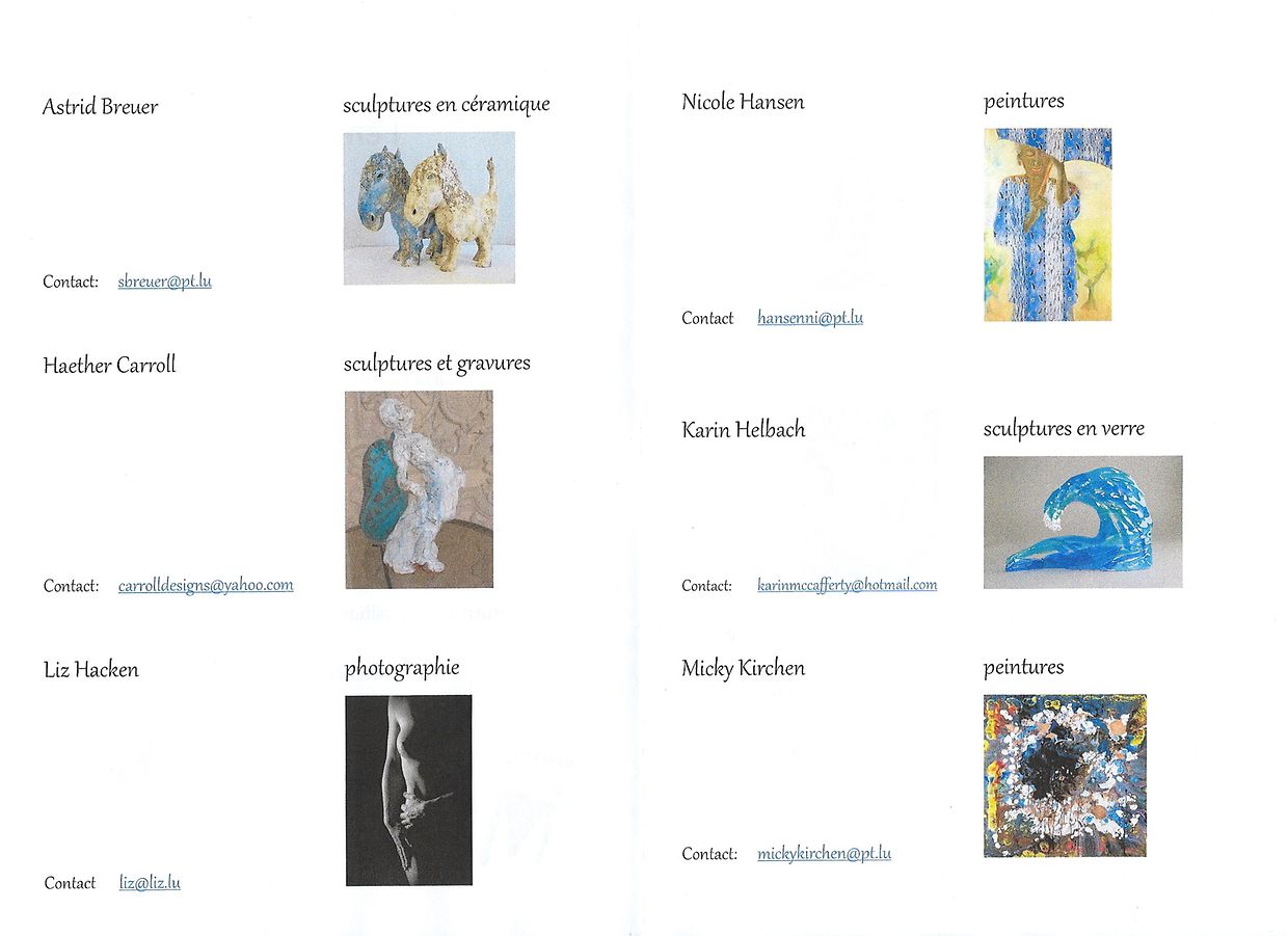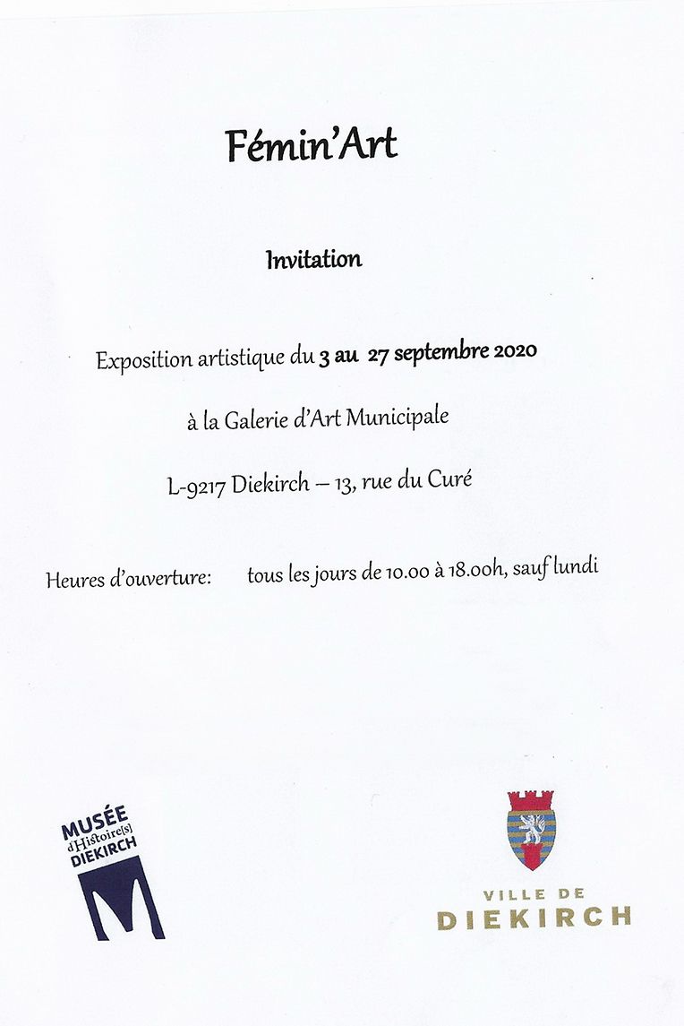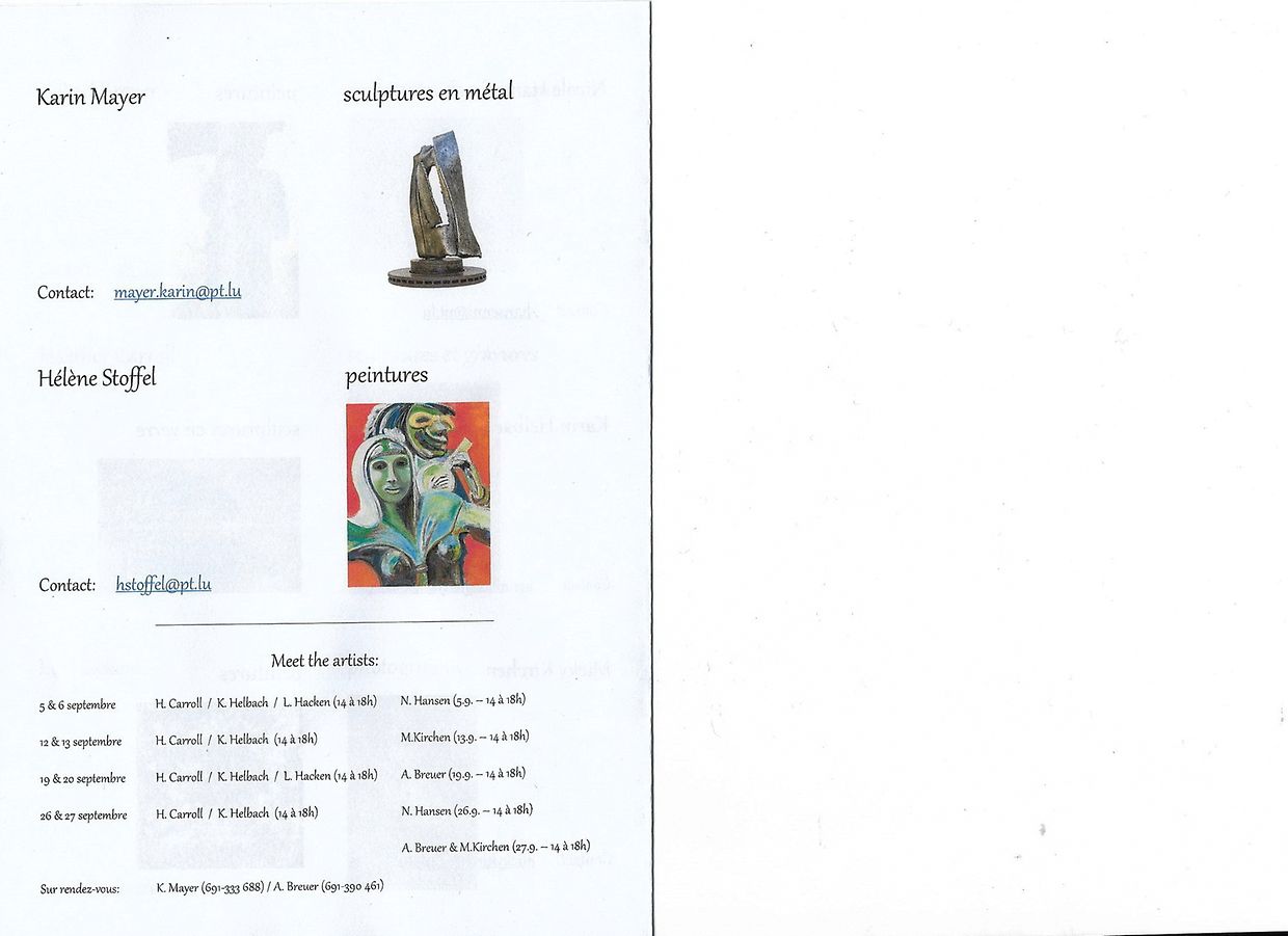 Diekirch: Gleich acht Künstlerinnen stellen zurzeit ihre Werke unter dem Thema „ Femin’Art“ in der „ Maison de la Culture“ in Diekirch, aus. Unter den Exponenten zählen u.a. Karin Mayer mit ihren starken abstrakten Stahl- Skulpturen, die aus brutalem, groben Metallschrott erschaffen wurden. Karin Helbach möchte mit ihren leuchtenden Glas- Skulpturen ein Lächeln in die Augen des Betrachters, zaubern. Astrid Breuer zeigt ihr Können mit phantasievollen und bunten Tier- Skulpturen aus Keramik. Micky Kirchen stellt farbenreiche und kreative Bilder aus, die aus einer spontanen Mischung von Acryl und Resin entstanden sind. Heather Carroll mit ihren wunderbaren Gravuren, die über die Reise der Gedanken durch das spirituelle Leben, führen. Mit ihren schwarz- weiß Fotografien weis Liz Hacken die Frau als Kunstobjekt, in den Vordergrund zu stellen. Nicole Hansen dagegen inspiriert mit farbenfrohen Bildern durch das weibliche Wesen, so wie auch Hélène Stoffel, die mit ihren Gemälden aus kräftigen Farben, die Frau als Thema zur Schau stellt. Diese sehenswerte Ausstellung in der „Maison de la Culture“, 13, rue du curé in Diekirch ist noch bis zum 27. September täglich außer Montags jeweils von 10 bis 18 Uhr zu besichtigen. Der Eintritt ist frei. (Text/FOTOS: CHARLES REISER)
