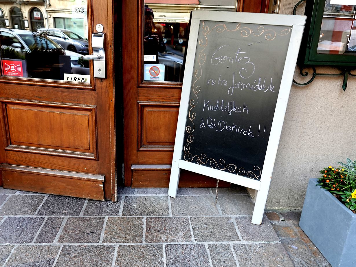 In Diekirch allerdings wird der Kuddelfleck "paniert" zubereitet und knusprig braun wie ein Schnitzel auf einem Teller serviert, mit Champignonsoße. Das Rezept ist Geheimsache des Küchenchefs. In einzelnen vornehmen Restaurants wird am Eingang auf diese kulinarische Dikricher Spezialität hingewiesen. Ich habe neulich eine solche Hinweistafel fotografiert, mit einem guten Stackdiekircher Freund anschließend Kuddelfleck bestellt und genossen.