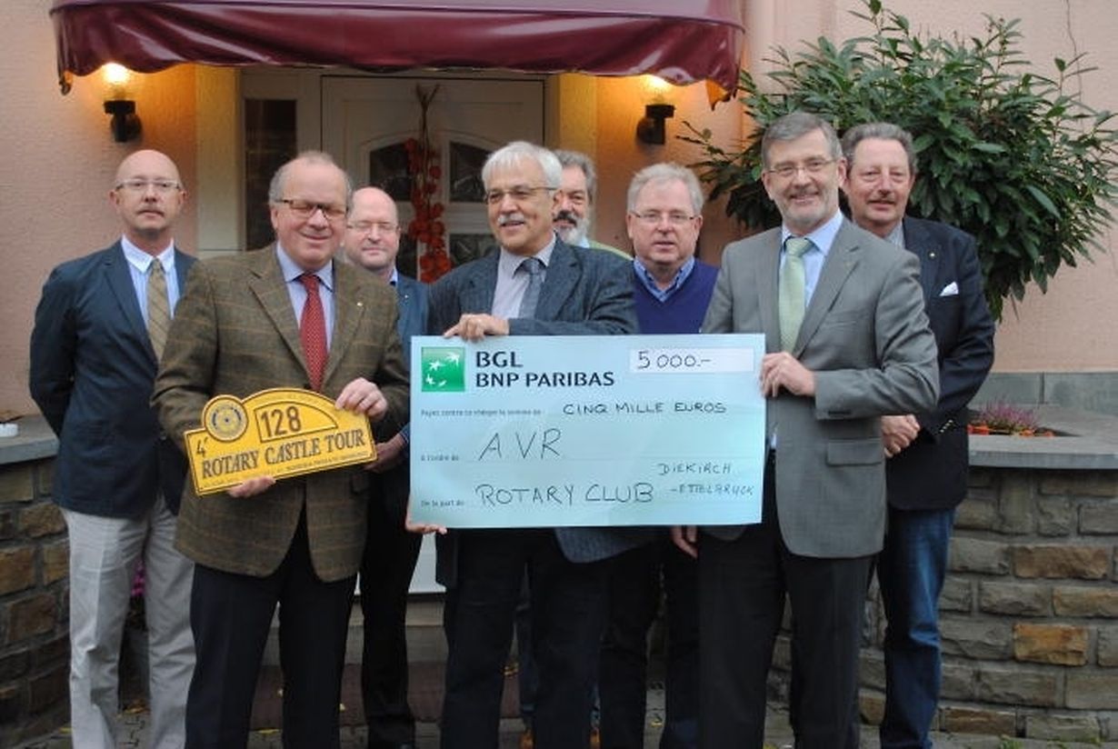 Ein Scheck über 5 000 Euro wurde vom Rotary Club Diekirch/Ettelbrück dieser Tage an die „Association nationale des victimes de la route“ (AVR) im Restaurant Infalt in Diekirch überreicht. Dieses Geld wurde während der „Rotary Castle Tour 2012“ gesammelt und ist für das Projekt „Coaching“ der AVR bestimmt.