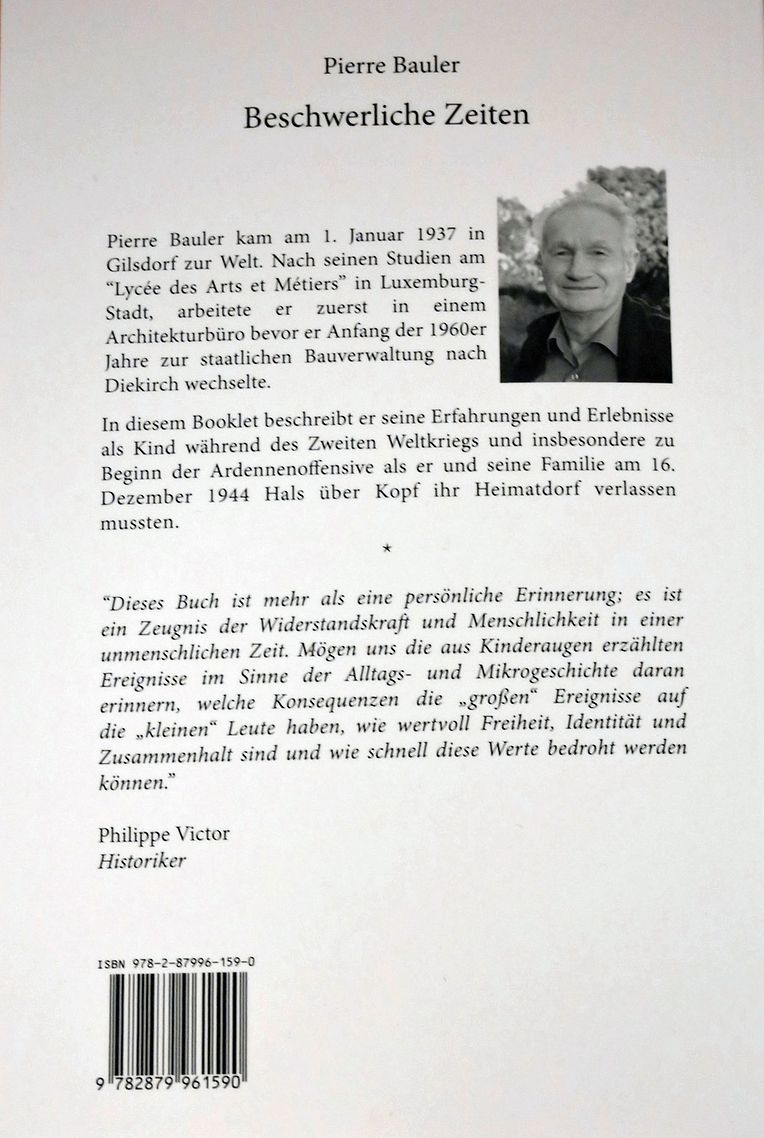 Den 12. November goufen dem Pierre Bauler, Joergang 1937, seng Erënnerungen u seng Kandheet am Zweete Weltkrich am nationale Militärgeschichtsmusee zu Dikrich (MNHM) virgestallt. Dat neit Buch ass am August erauskomm a beschreift d’Liewen ënner der däitscher Besatzung, d’Liberatioun duerch d’Amerikaner an déi dramatesch Flucht vun der Famill Bauler-Greisen vu Gilsdref iwwer Dikrich an d’Stad während der Ardennenoffensiv.