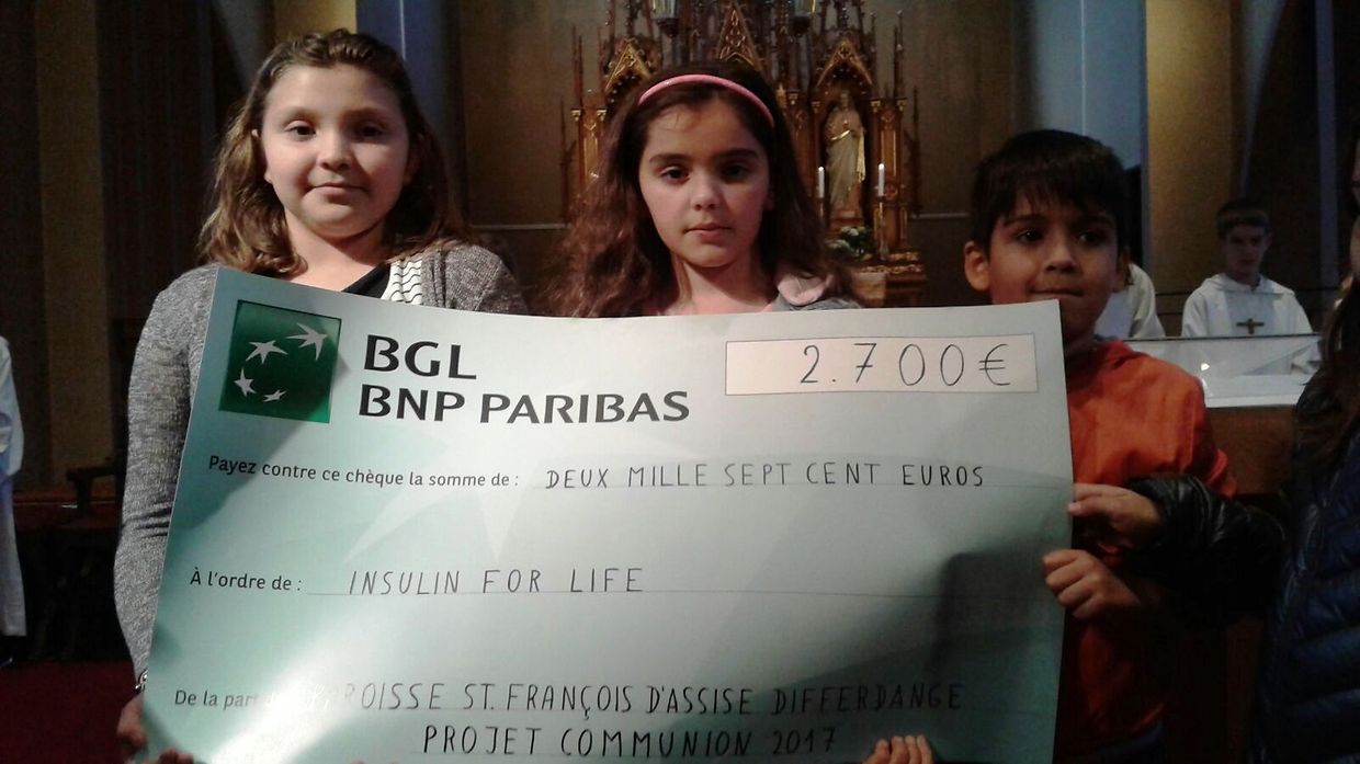 D’Kanner vun der Franziskuspoar aus der Gemeng Déifferdéng hu während hierer Kommiounsvirbereedung mat verschiddenen Aktivitéiten Sue gesammelt a konnten esou der Lëtzebuerger Diabetikerassociatioun ALD e Chèque vun 2 700 € iwwerreechen, fir hiere Projet « Insulin for Life ».