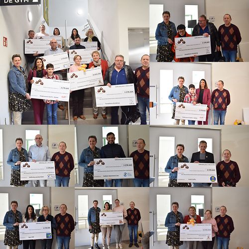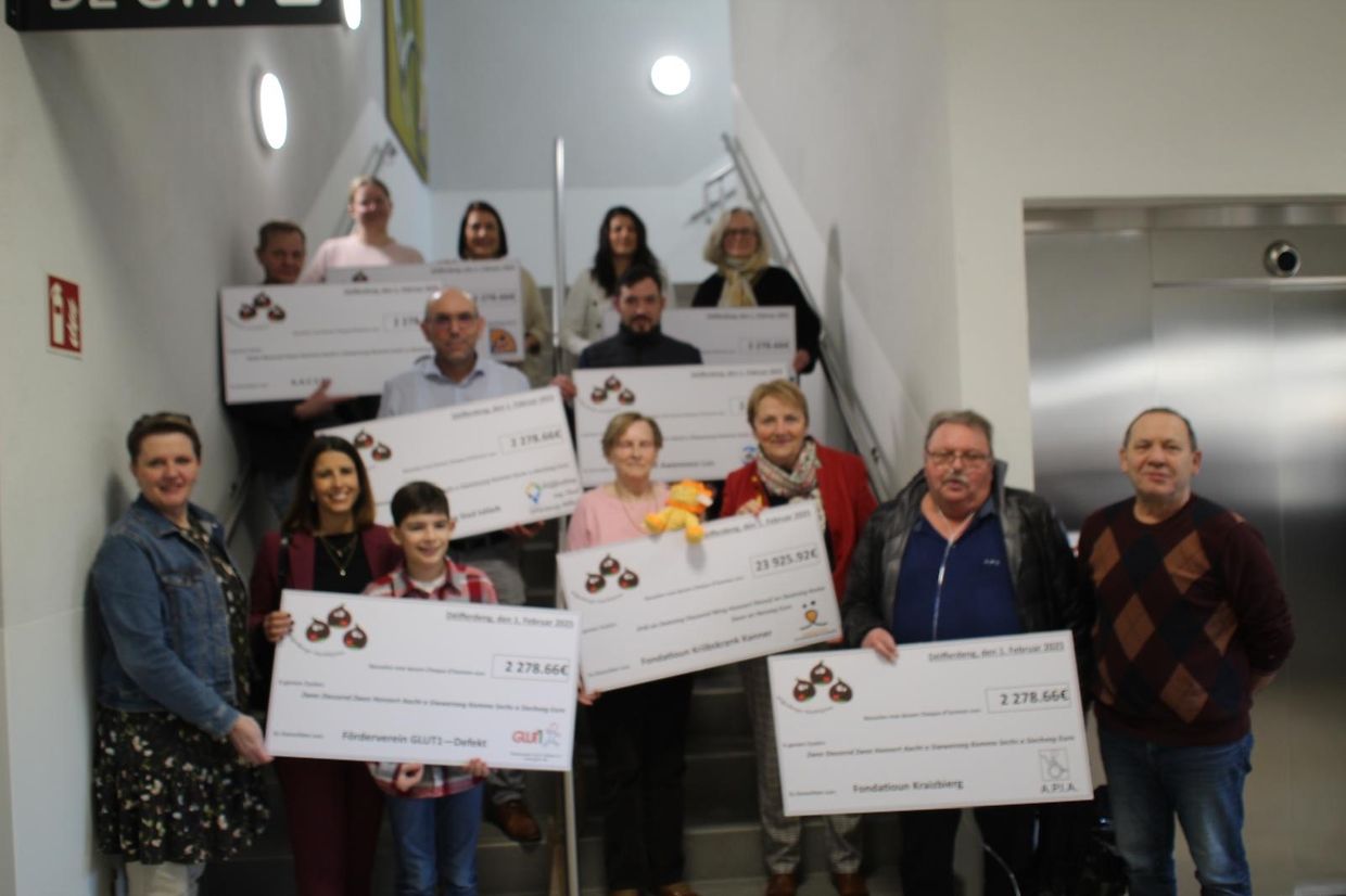 Mee trotzdem kennen mier Stolz op dei Somme sinn ewou mier wärten iwwerrechen. Am ganzen hun mier un 7 Assosiatiounen (Ancien combattants, Autisme Lëtzebuerg, Förderverein Glut1 defekt, Aipa Kraizbierg, Ligue HMC,Autism Awareness Association Luxembourg an Deifferdeng eng Stadt dei helleft) jeweils 2.278,66€ iwwerwissen. den greissten Scheck ass awer ewei Traditioun an och eis Statuten et virgesinn un Fondatioun kriibskrank Kanner gangen dest mat enger Somme vun 23.925,22€.