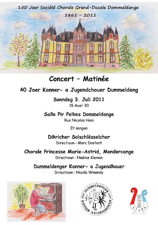 Société Chorale Grand-Ducale Dummeldeng an den Dummeldenger Kanner- a Jugendchouer invitéieren op hir Kannermatinée den 03. Juli 2011 ëm 15:30 am Sall Pir Pelkes zu Dummeldeng an der Primärschoul. Op dësem Concert, den am Kader vun de 150 Joerfeiere vun der Société Chorale Grand-Ducale Dommeldange stattfënnt, trieden op d'Chorale Princesse Marie-Astrid vu Monnerech ënnert der Leedung vum Nadine Kleman, Dikricher Solschlësselcher ënnert der Leedung vum Marc Doster an die 2 Gruppen vum Dummeldenger Kanner- a Jugendchouer ënnert der Leedung vum Nicole Winandy.