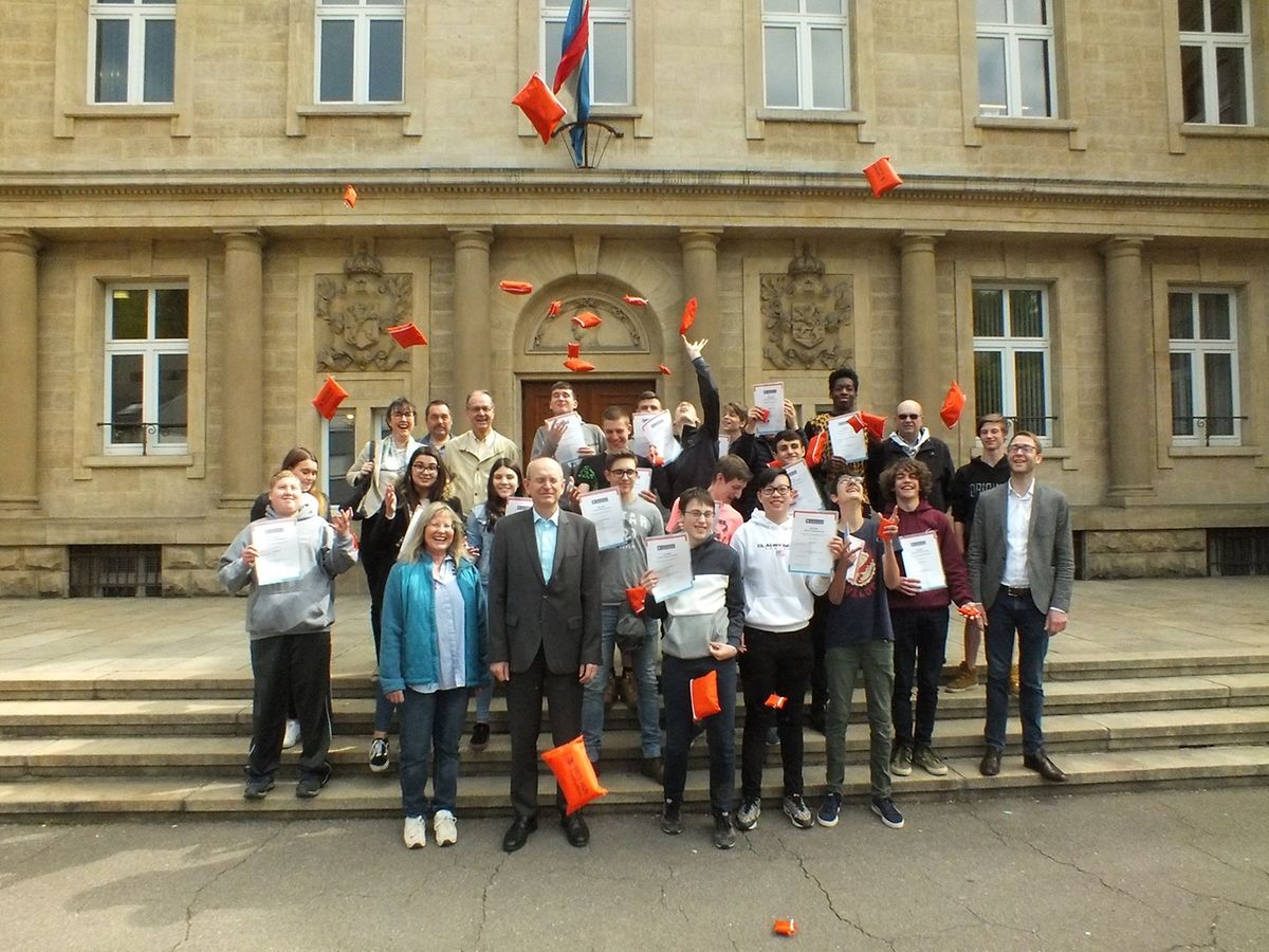 Diese Lehrgänge bietet die Privatschule seit über 25 Jahren regelmäßig ihren 15-jährigen Schülern an. Am Montag, dem 30. April 2019 würdigte Guillaume Schaack (responsable Service Ambulances de la Croix Rouge luxembourgeoise), den Einsatz der 6ème-Schüler, die in ihrer Freizeit an den Kursen teilgenommen haben und überreichte ihnen die Zertifikate.