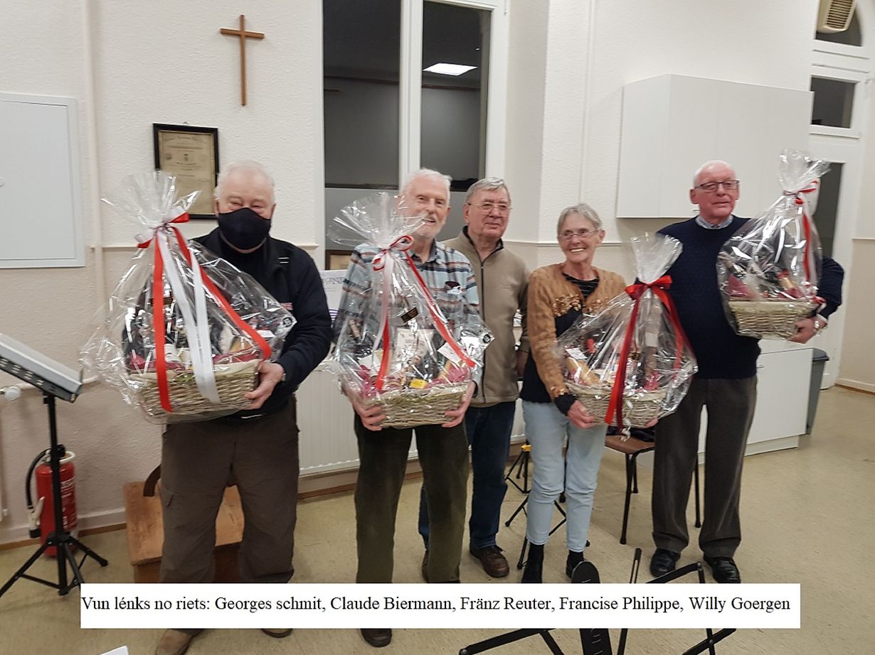 An senger rezenter Sëtzung huet de Comité vun der Société Chorale Grand-Ducale Dummeldeng festgestallt dat duerch déi laang an kontaktarm Corona-Zeit vill vum soziale Liewen gelidden oder vergiess gin ass. Am Verein hun 4 Memberen 80 Joer kritt. Ët ass awer nie ze spéit fir eppes gutt ze maachen. An esou huet de Comité um Enn vun där nächster Prouf e Cadeau fir déi 4 Leit organiséert an hinnen fir hier 80 Joer gratuléiert an Merci gesot fir hir laang Trei zum Verein, verbonnen mat engem gudden Patt fir de ganze Verein.