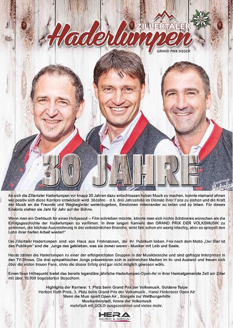 Wahre Liebe und Herzblut für die Musik – das zeichnet die Zillertaler Haderlumpen aus und macht sie zu dem, was sie sind: gern gesehene Gäste in allen großen TV-Shows, vielfach mit Gold ausgezeichnet und Sieger im Grand Prix der Volksmusik. Darüber hinaus sind Vitus, Peter und Reinhard, die 2017 ihr 30-jähriges Bühnenjubiläum feiern, vor allem eines: am Boden geblieben. Sie leben genau das Leben, von dem sie singen, lieben ihr schönes Zillertal und ihre Familien – das merken die Fans, die zu Tausenden zu den Konzerten stürmen und ihre Lumpen stets hautnah erleben dürfen. Über 140 Mal im Jahr steht das Trio jährlich auf der Bühne und füllt die Hallen in ganz Europa, heute mit derselben Leidenschaft wie vor 30 Jahren – ganz einfach, weil die Musik ihr Leben ist!