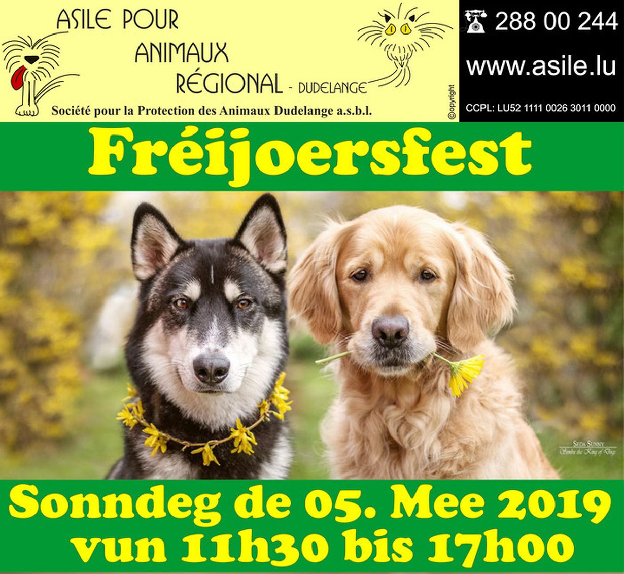 Le 5 mai, l’asile pour animaux Dudelange invite à sa traditionnelle journée porte-ouverte au Parc Le’h et souhaite la bienvenue à tous ses visiteurs – à 2 ou à 4 pattes. Le personnel de l’asile vous accueillera entre 11h30 et 17h00 heures. Boissons et snacks sur place. Plus d’infos www.asile.lu