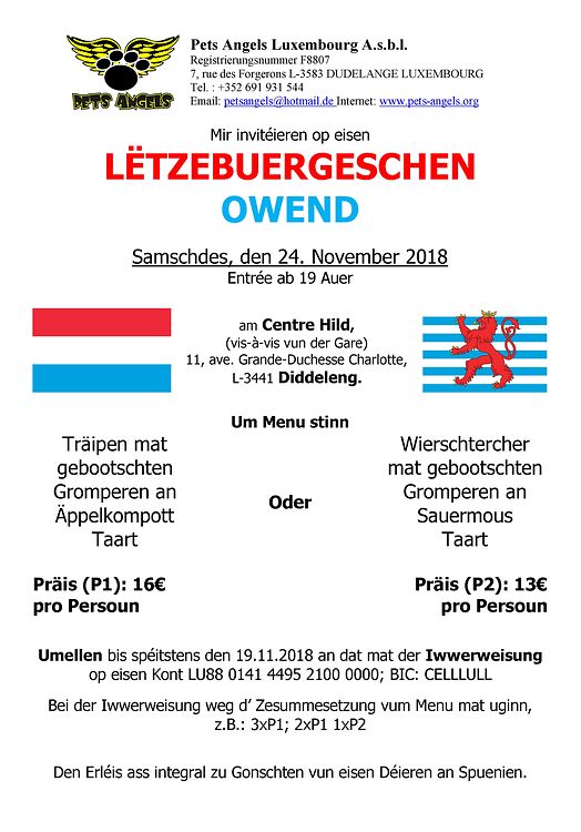 Kommt bei Pets-Angels den 24ten November a genéisst Lëtzebuergesche Kascht mat lëschteger Musek an engem flotte Quiz.