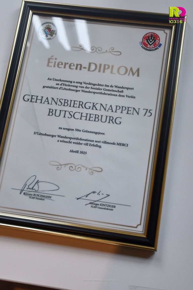 50 Joer Gehansbiergknappen zu Diddeleng. Dat ass 50 Joer Wanderen zu Diddeleng. An dat geheiert sech gefeiert.