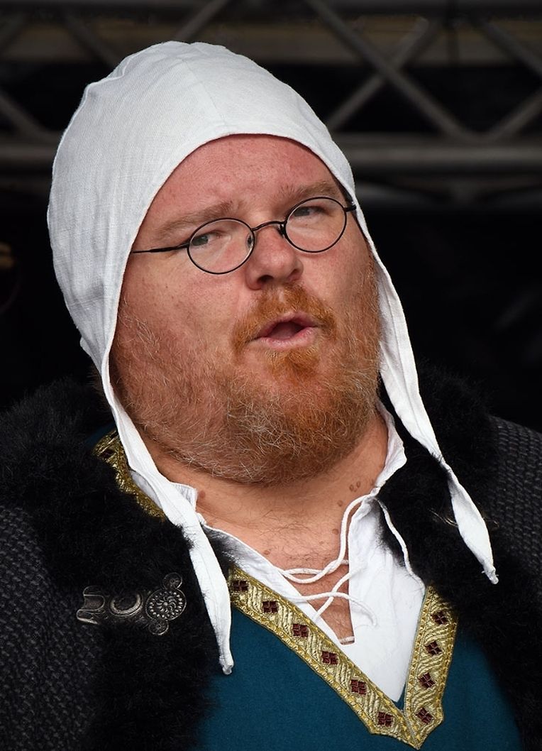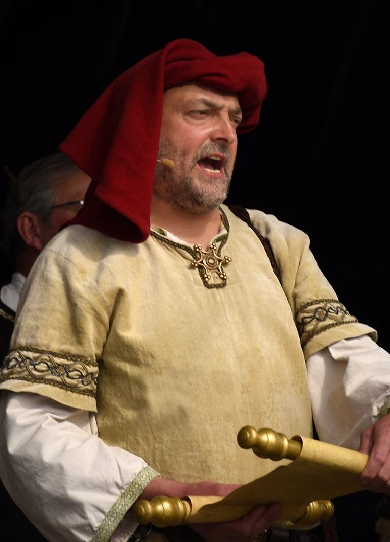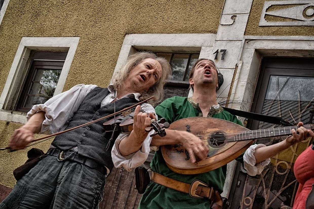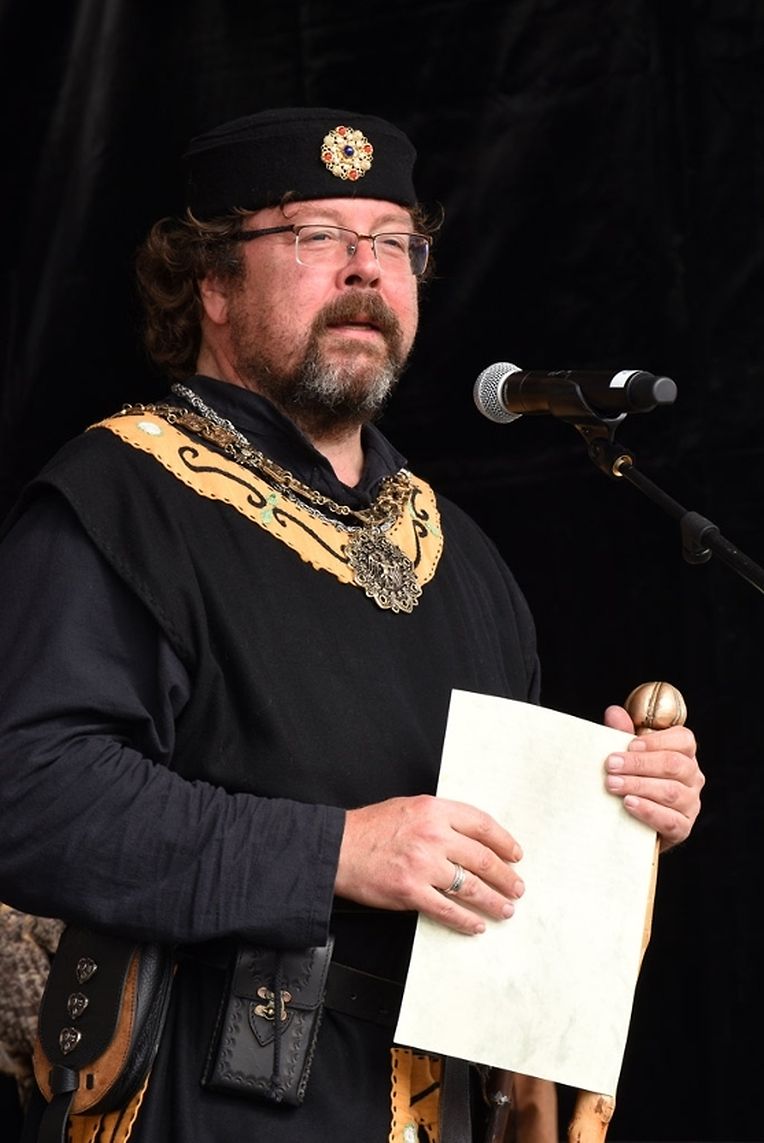 No der Mëttesstonn war en Cortège deen bis op d'Haaptbühn gaangen ass. Do sinn op typesch mëttelalterlech Manéier all d'Kënschtler déi do waren, - an et waren der nawell vill - virgestallt ginn. De Buergermeeschter Dan Biancalana esou wéi seng zwee Virgänger Mars Di Bartolomeo an den Alex Bodry waren och vun der Partie. Si waren och an engem mëttelalterlechen Outfit komm. An d'Wieder huet sech nawell och gutt gehalen an dat war gutt fir déi vill Participant'en déi op der Plaz waren, awer och fir déi immens vill Visiteuren déi do waren. Et ass een bal net méi laanschteneen komm, esou struppevoll war d'Rue de la Chapelle.