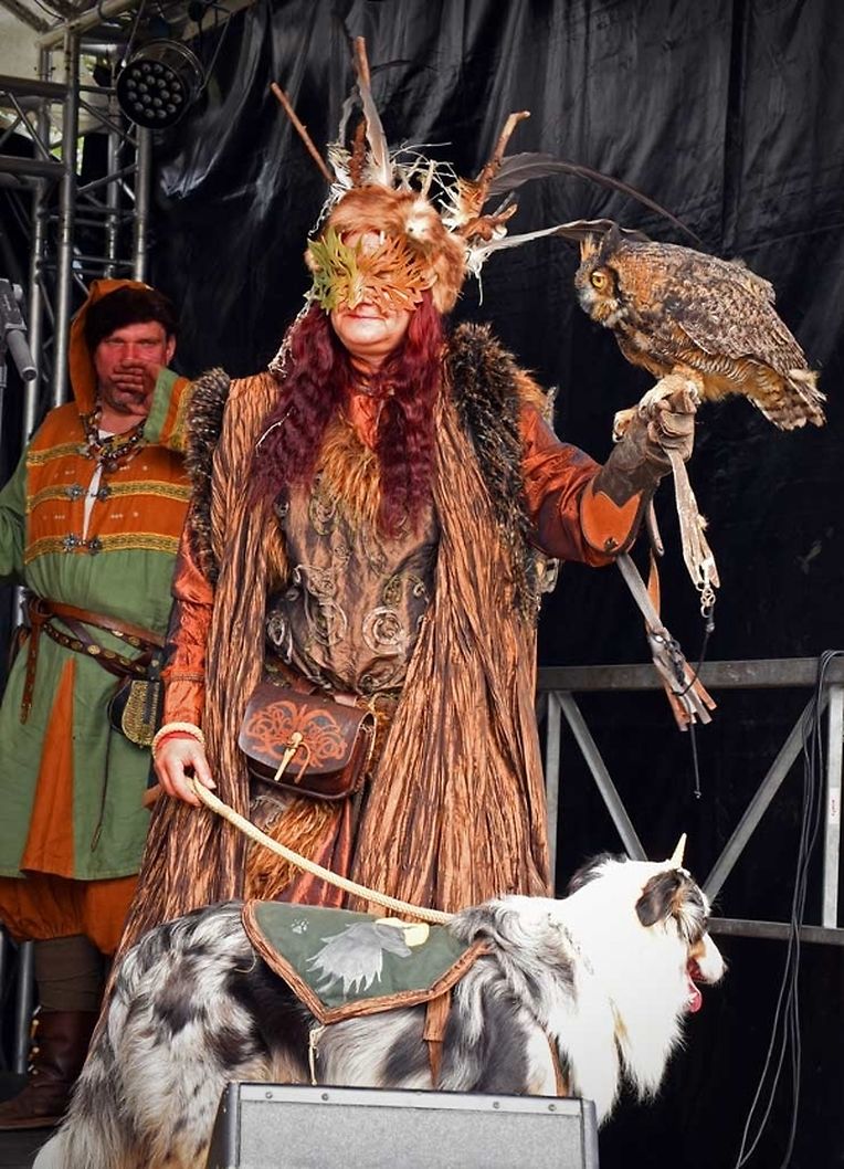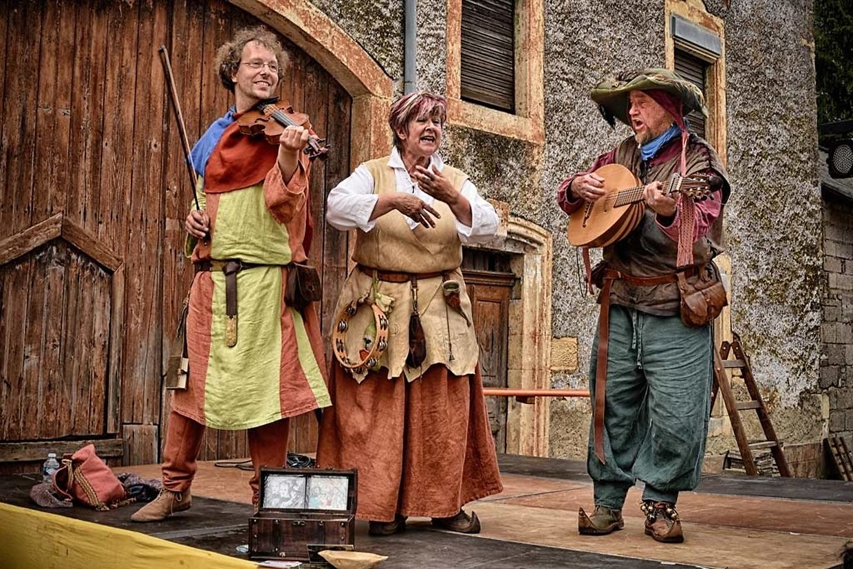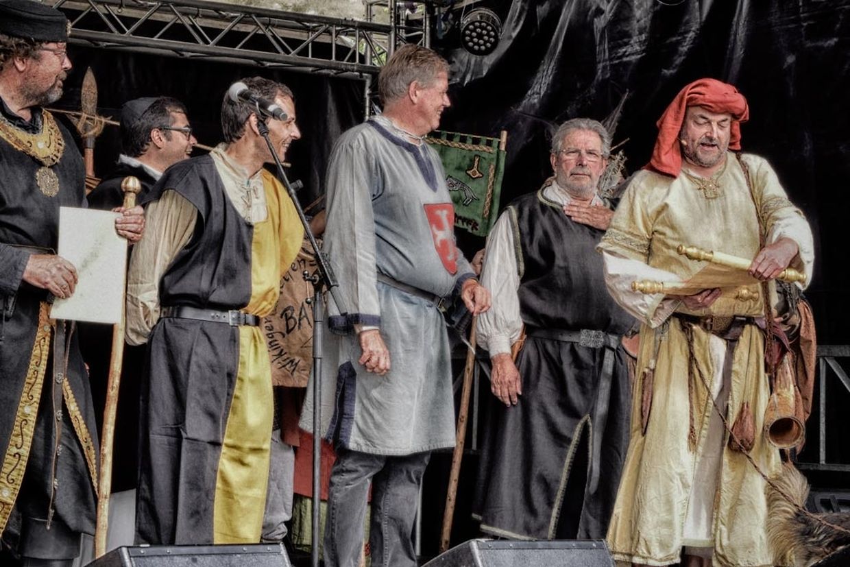 No der Mëttesstonn war en Cortège deen bis op d'Haaptbühn gaangen ass. Do sinn op typesch mëttelalterlech Manéier all d'Kënschtler déi do waren, - an et waren der nawell vill - virgestallt ginn. De Buergermeeschter Dan Biancalana esou wéi seng zwee Virgänger Mars Di Bartolomeo an den Alex Bodry waren och vun der Partie. Si waren och an engem mëttelalterlechen Outfit komm. An d'Wieder huet sech nawell och gutt gehalen an dat war gutt fir déi vill Participant'en déi op der Plaz waren, awer och fir déi immens vill Visiteuren déi do waren. Et ass een bal net méi laanschteneen komm, esou struppevoll war d'Rue de la Chapelle.