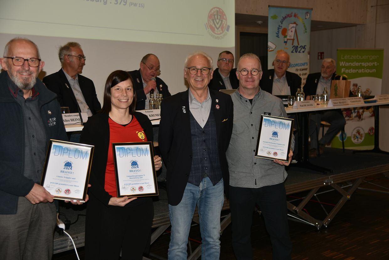 Nach den Begrüßungsansprachen von der lokalen Präsidentin Chantal Klein und dem Bürgermeister Dan Biancalana blickte FLMP-Präsident Romain Buschmann auf ein erfolgreiches Jahr zurück. Die Zufriedenheit der Wanderer und Gäste ist das Hauptziel bei den Wanderveranstaltungen. Dass damit der richtige Weg eingeschlagen wurde, bestätigt der Zuwachs von 15% an Teilnehmern im vergangenen Jahr. Trotzdem ist noch Potenzial vorhanden, um weitere Wanderfreunde an den IVV-Veranstaltungen zu interessieren, so der Verbandspräsident. Dafür müssen keine neuen Wege eingeschlagen werden, sondern die bestehenden Möglichkeiten genutzt und ausgebaut werden. Die 3. Auflage des Wandersummer bietet hier mehrere Möglichkeiten, welche von allen Vereinen genutzt werden sollen. Seit vergangenem Jahr hat der Wandersportverband sein eigenes Maskottchen, den FLuMPi, welcher besonders die jüngeren Wanderer zur körperlichen Bewegung anregen soll. Im Fokus steht bereits jetzt die Organisation der 20. IVV-Olympiade im Jahr 2027 in Luxemburg. Hierzu haben bereits viele Gespräche und Treffen stattgefunden und dieses internationale Event soll für alle Teilnehmer, dank der Zusammenarbeit mit mehreren Ministerien sowie mit dem Radsport- und Schwimmsportverband, zu einem unvergesslichen Erlebnis werden. Abschließend betont der Präsident der Wandersportfederation nochmals, dass man nur mit einer stetigen Weiterentwicklung und mit kreativen Impulsen überlebensfähig bleiben kann.