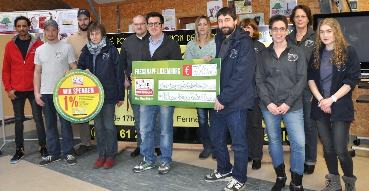 Den 1. Deel vun deem generéisen Don - nämlech 7015,22 € - gouf kierzlech vum Oliver Müller aus der Fressnapfdirektioun un de Regionalen Déierenasyl-Diddeleng iwwerreecht.