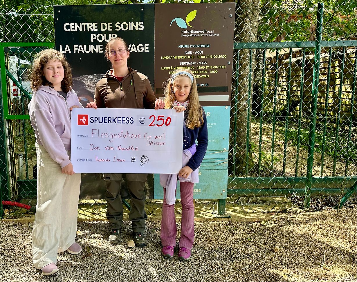 Am 24. Mai 2024 veranstalteten unsere Nachbarn in unserer Straße ein Nachbarschaftsfest. Wir, Emma und Hannah, haben beschlossen, an einem Stand Muffins, Brownies, Schokolade, Bücher, Anhänger und selbstgemalte Bilder für einen guten Zweck zu verkaufen. Wir sammelten Spenden für die Pflegestation für Wildtiere in Düdelingen. Am Ende des Nachbarschaftsfestes haben wir die Spendenbox geöffnet und das Geld gezählt. Es waren 250 Euro. Wir freuten uns riesig und schrieben gleich am nächsten Tag eine E-Mail an die Verantwortlichen der Pflegestation. Zwei Tage später bekamen wir eine Antwort. Sie freuten sich sehr über unsere Spende und luden uns ein, die Station zu besuchen. Die Vorfreude war groß und am 11. Juni 2024 war es dann endlich so weit. Wir gingen in die Pflegestation und übergaben den Scheck. Eine Verantwortliche der Pflegestation führte uns herum, zeigte uns verschiedene Tierpatienten und machte zusammen mit uns und dem Scheck ein Foto. Das wird sicher nicht unsere einzige Spendenaktion bleiben.