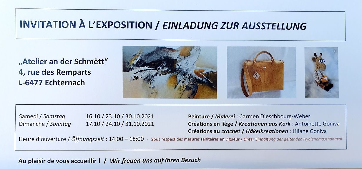 Echternach Einladung zur Ausstellung 11 Okt 2021 11 Okt Mehr 11 Okt Antoinette Goniva Veröffentlicht am Freitag, 8. Oktober 2021 um 12:41 4 Rue des Remparts, 6477 Echternach, Luxemburg Ausstellung 16. bis 31. Oktober 2021 Malerei : Carmen Dieschbourg Kreationen aus Kork : Antoinette Goniva Häkelkreationen : Liliane Goniva Unpassenden Inhalt angeben Weitere Neuigkeiten von Antoinette Goniva > AFE - remise de prix à l'école fondamentale d'Echternach 18.07.21 Echternach AFE - Remise de prix à l'école fondamentale d'Echternach 10.07.20 Echternach Amitiés Françaises d'Echternach : un programme culturel riche et varié 24.03.18 Echternach 11 Joer, käergesond a flénk 23.09.17 Echternach Les Amitiés Françaises d'Echternach au Parlement européen de Strasbourg 14.09.17 Echternach