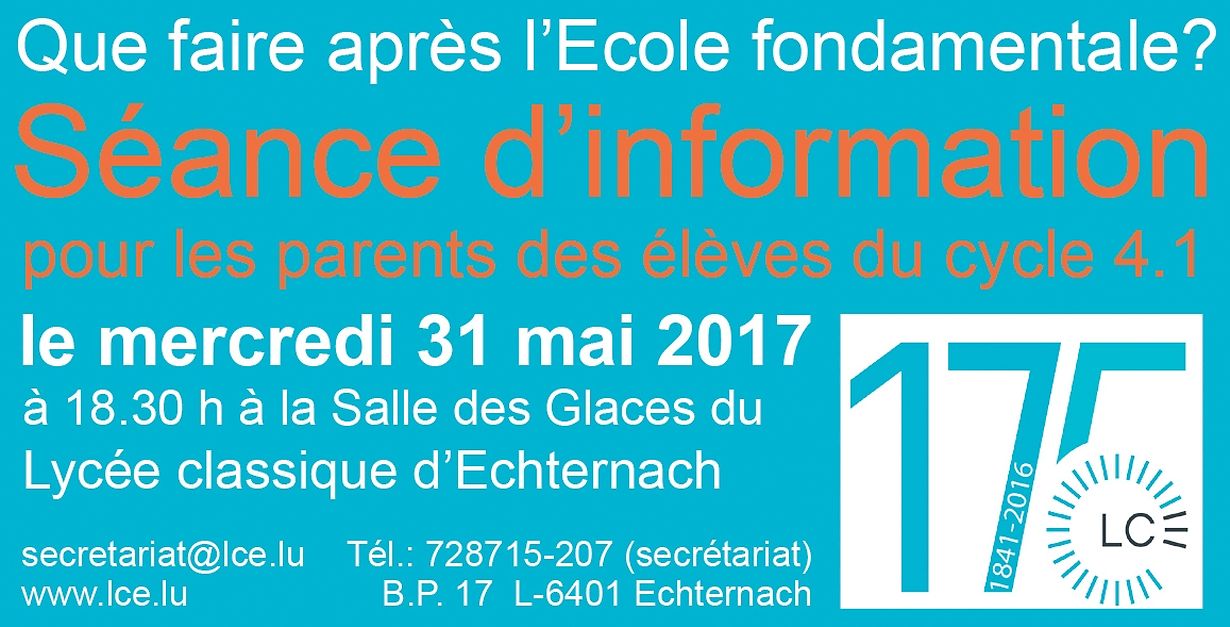 Echternach Que faire après l'Ecole fondamentale? 31 Mai 2017 31 Mai Mehr 31 Mai Annik Schank Veröffentlicht am Montag, 29. Mai 2017 um 15:16 Echternach, Luxemburg Unpassenden Inhalt angeben Weitere Neuigkeiten von Annik Schank > Generéisen Don vum Lënster Bicherclub 21.10.21 Echternach En aussergewéinlecht Schouljoer- eng aussergewéinlech Diplomfeier am LCE! 09.07.20 Echternach Konscht fir den Déiereschutz 21.10.19 Echternach "Septimanerrallye 2019" am LCE 09.10.19 Echternach Félicitations aux bacheliers du LCE 08.07.19 Echternach
