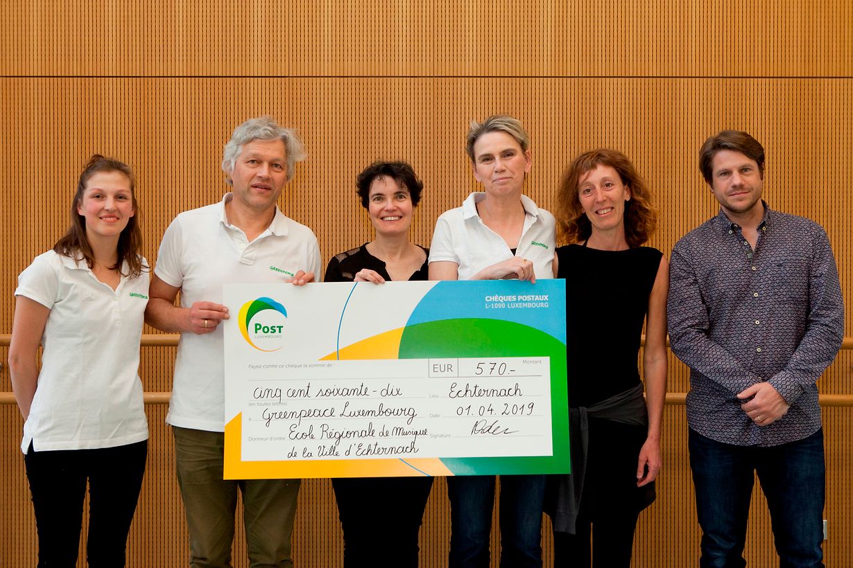 Am Kader vun eisem Danzspektakel "Les larmes de Gaïa" am Dezember am Trifolion Echternach ënnert der Leedung vum Sieglinde Nies haten d'regional Museksschoul vun Iechternach intensiv mat Greenpeace Luxembourgzesummen geschafft. Doropshin hunn sie decidéiert d'Quête vun hierem Chrëschtconcert un Greenpeace ze spenden. d'Lescht Woch war dann d'Chèque Iwwerreechung am Danzsall vun der Iechternacher Museksschoul an Präsenz vum Direkter vun Greenpeace Raymond Aendekerk, den Mataarbeschter Martina Holbach an Myrna Koster, dem Sieglinde Nies, der Directrice Nadine Eder an dem Directeur-adjoint Marc Demuth.
