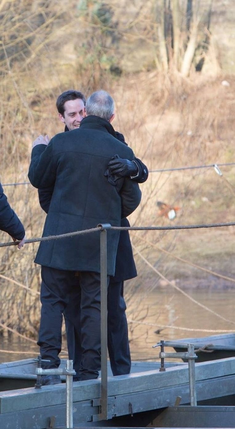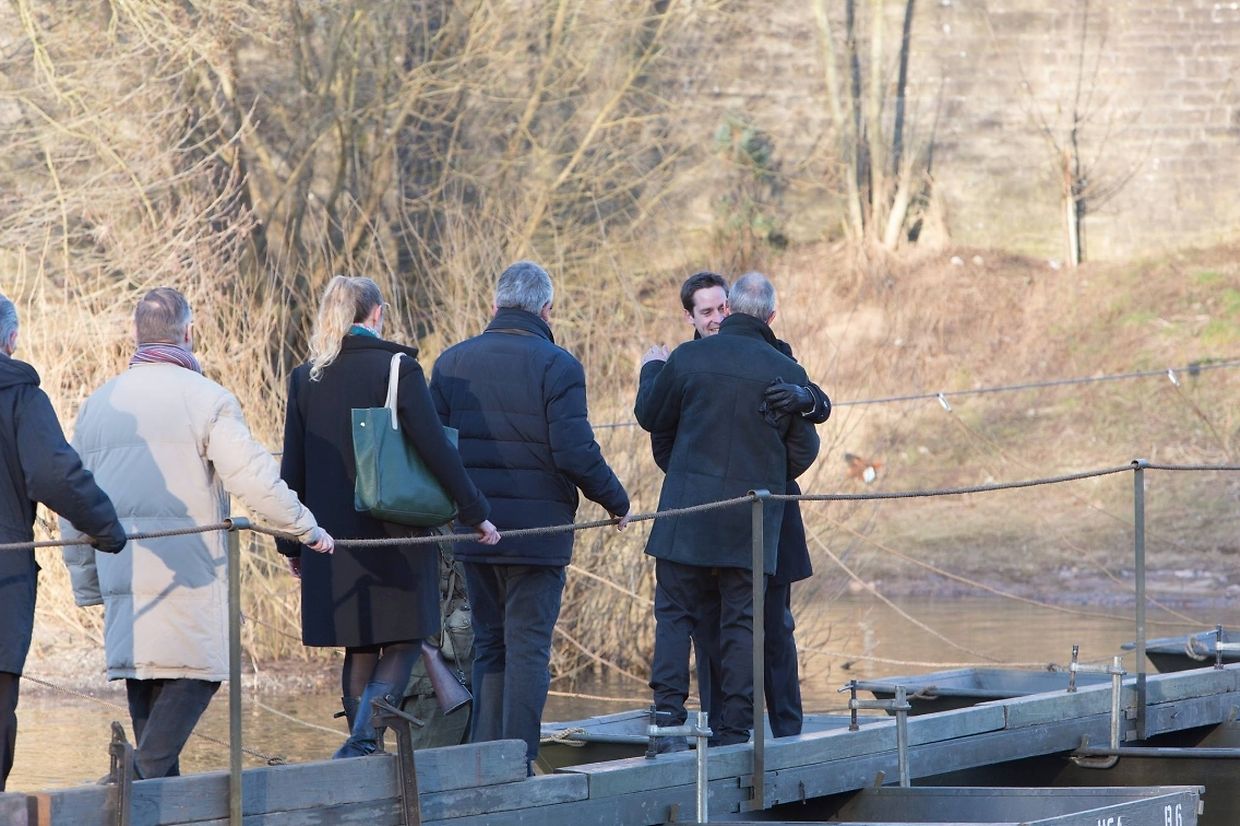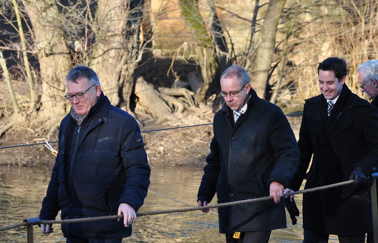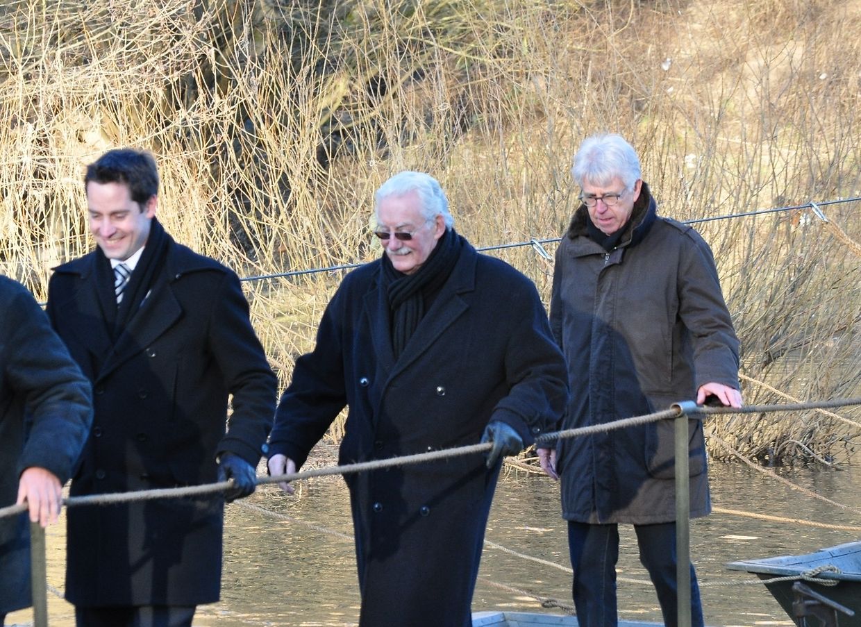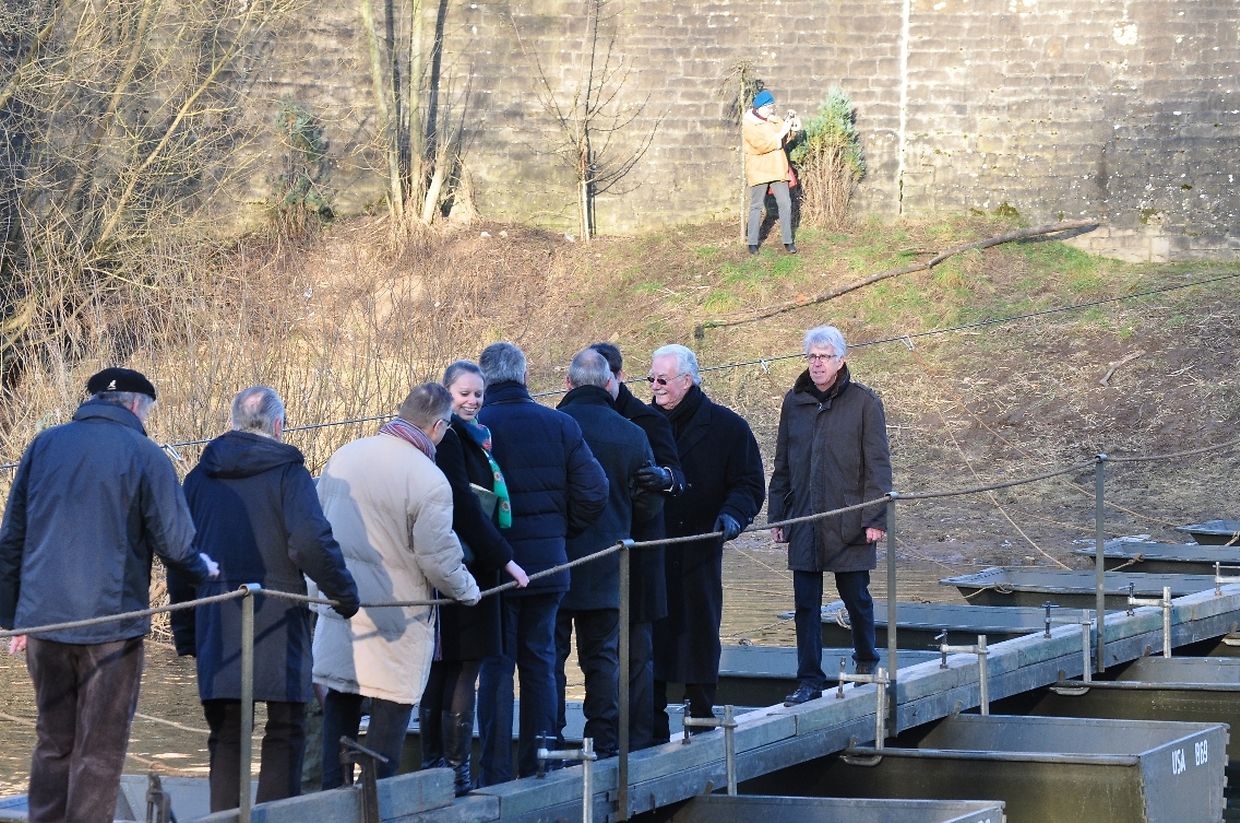 Samstag, den 7. Februar 2015 - Freundschaftlicher Händedruck zwischen den deutschen und luxemburgischen Autoritäten in der Mitte der rekonstruierten Fußgängerbrücke.