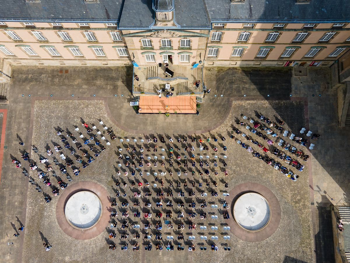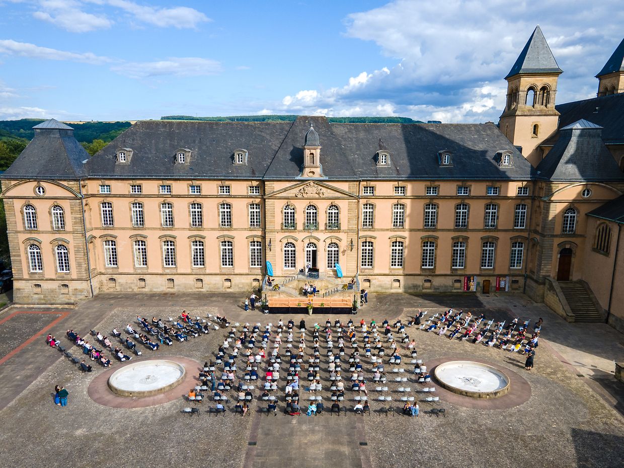 No engem Kader huet net laang misse gesicht ginn: De pittoresken Abteihaff, deen dem „social distancing“ beschtens entsprécht, war déi perfekt Location fir déi 400 Leit, déi un der Diplomiwwerreechung deelgeholl hunn. Dobäi huet d‘Gemeng Iechternach bei der Realisatioun vun dësem Owend vill gehollef. Si huet net nëmmen d‘Still geléint, mee d’Equipe vum Fierschter Tom Muller huet innerhalb kierzester Zäit eng stabil Bün virun der Haapttrap opgeriicht, déi vum technesche Personal vum LCE amenagéiert a vun der Gäertnerin vum Iechternacher Lycée wonnerschéi mat Blummenarrangementer dekoréiert gouf.