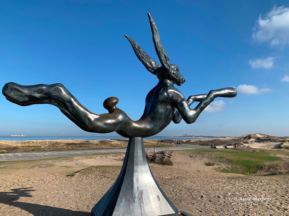 Bronzehase des britischen Bildhauers Barry Flanagan (1941-2009), einer der markantesten Persönlichkeiten der Nachkriegsbildhauerei. Seine weltberühmten majestätischen Hasen sind ebenfalls ein Wahrzeichen auf der New Yorker Park Avenue und im Grant Park in Chicago geworden.