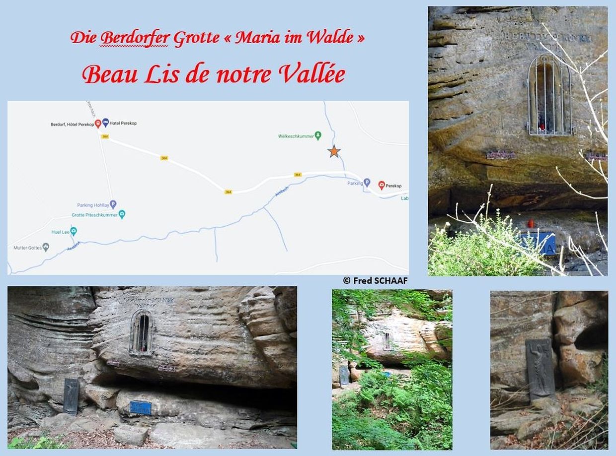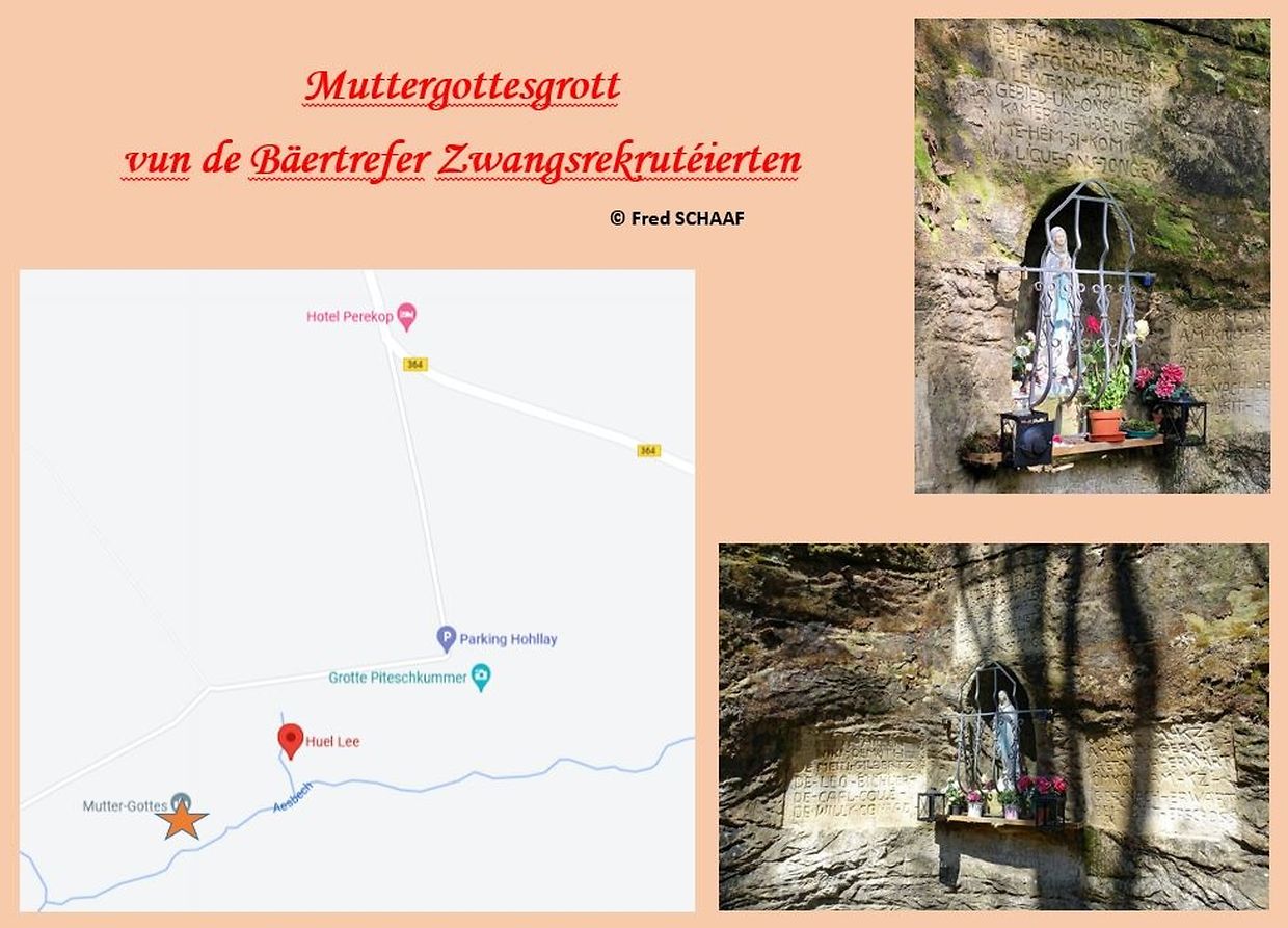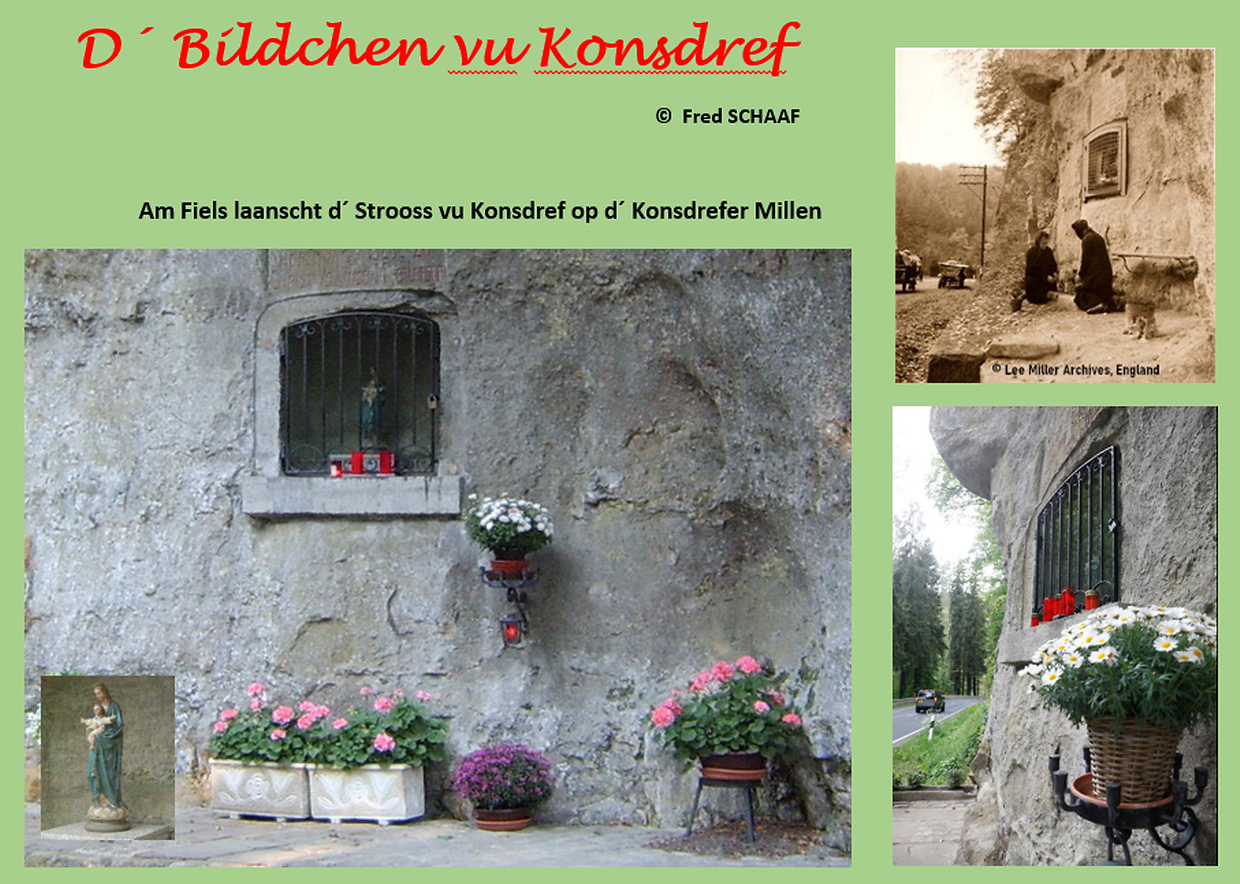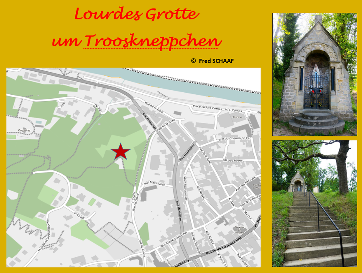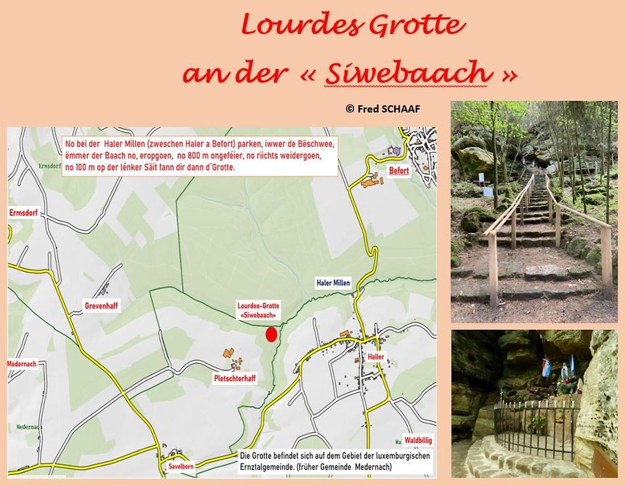 Ech beschränke mech des Kéier op eng Säit pro Grott, mat 2 Fotoen a mat engen Hiweis ( * ) wou een des Grotte fënnt oder siche goe kann. Et soll e Versuch sënn dëse wäertvolle reliéise Patrimoine ze erhalen, e méi bekannt ze maachen an opzewäerten.
