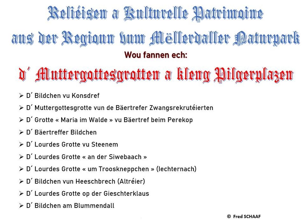 An der Regioun Mëllerdall – Kleng Lëtzebuerger Schwäiz fënnt e vill kulturelle a reliéise Räichtum. Heibäi ginn d´Muttergottesgrotten awer net vergiess och wa wéineg op si higewise gëtt oder hir Plaz oft onbekannt a schwéier ze fannen ass. Heimat wëll ech dozou en Ufank maachen an op si hinzeweisen. Unerkenne wëlle mer awer och déi vill benevole Aarbecht déi hei gemaach gëtt fir des Plazen propper ze maachen an ze ënnerhalen.