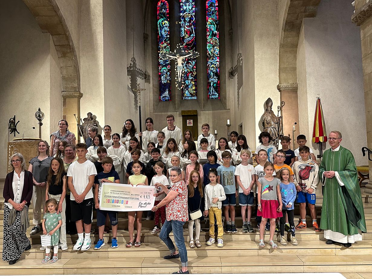 No der Joresoofschlossmass gouf e Scheck mat der stolzer Zomm vun 4.415€ vun de Kanner un d’Vertrieder vun der Konterbont a.s.b.l. iwwerreecht. D’Präsidentin Chris Fogens huet de Kanner, hire Familljen an och dem ganze Pastoralteam Merci fir de léiwe Gest gesot an erkläert, wat mat de gespente Suen alles gemaach gëtt fir bedierftege Mënschen an der Regioun ze hëllefen.