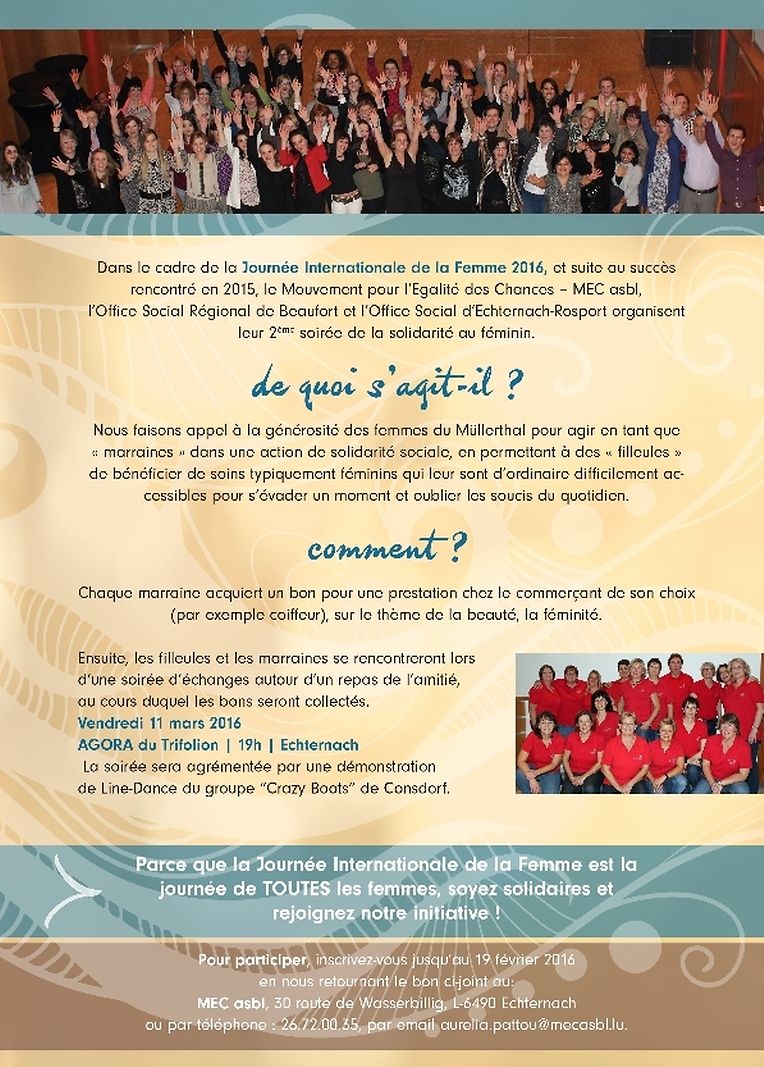 Dans le cadre de la Journée Internationale de la Femme 2016, et suite au succès rencontré en 2015, le Mouvement pour l'Egalité des Chances - MEC asbl, l'Office Social Régional de Beaufort et l'Office Social d'Echternach-Rosport organisent leur 2ème soirée de la solidarité au féminin.