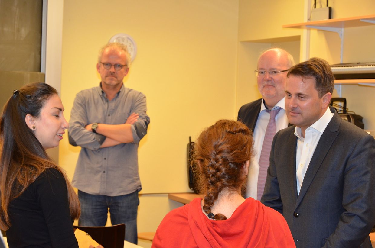 Danach besuchte der Premierminister auf seiner Stippvisite die Classe d’insertion pour jeunes adultes des LCE. Xavier Bettel begrüßte jeden Schüler dieser Integrationsklasse für junge Erwachsene persönlich. Dabei interessierte er sich für die Herkunft und die Schicksale der Flüchtlinge und Asylanten. Er lobte das Engagement der Lehrer dieser heterogenen Klasse. Nach einigen Unterrichtsstunden konnten sich einige dieser Studenten schon recht gut auf Französisch vorstellen.