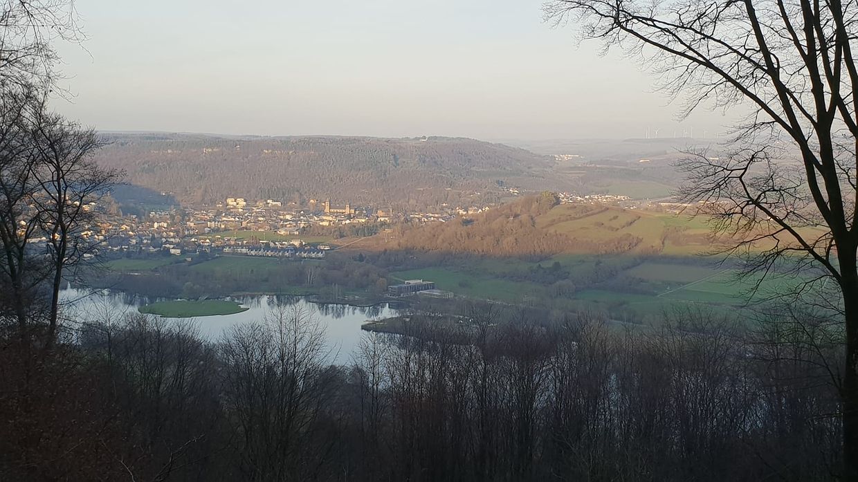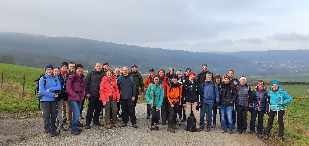 Pünktlich um 11.30 Uhr fanden sich 29 motivierte Teilnehmer jeden Alters in der Jugendherberge Echternach ein, um bei bestem, sonnigem, aber kaltem Winterwetter die Kalorien der Weihnachtstage zu verbrennen. Die etwa 19,5 km lange, geführte Wanderung führte vom See über das Echternacher Plateau am Rodenhof vorbei. Oben angekommen, staunten die Teilnehmer nicht schlecht über die weite Sicht über die gesamte Region und die spektakuläre Aussicht – der perfekte Platz also für einen kleinen Fotostopp und das obligatorische Gruppenfoto. Von hier aus ging es dann weiter nach Osweiler in Richtung Fromburg. Auf dem Fromburger Hof, bekannt für seine solidarische Landwirtschaft, wartete eine ganz besondere Überraschung auf die Wanderer. Mit hausgemachtem Glühwein und einem alkoholfreien Punsch konnten die Teilnehmer sich in der Scheune des Bauernhofes wieder aufwärmen, bevor sie die letzten 6 km in Richtung Jugendherberge in Angriff nahmen.