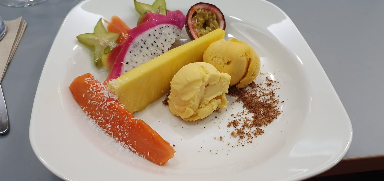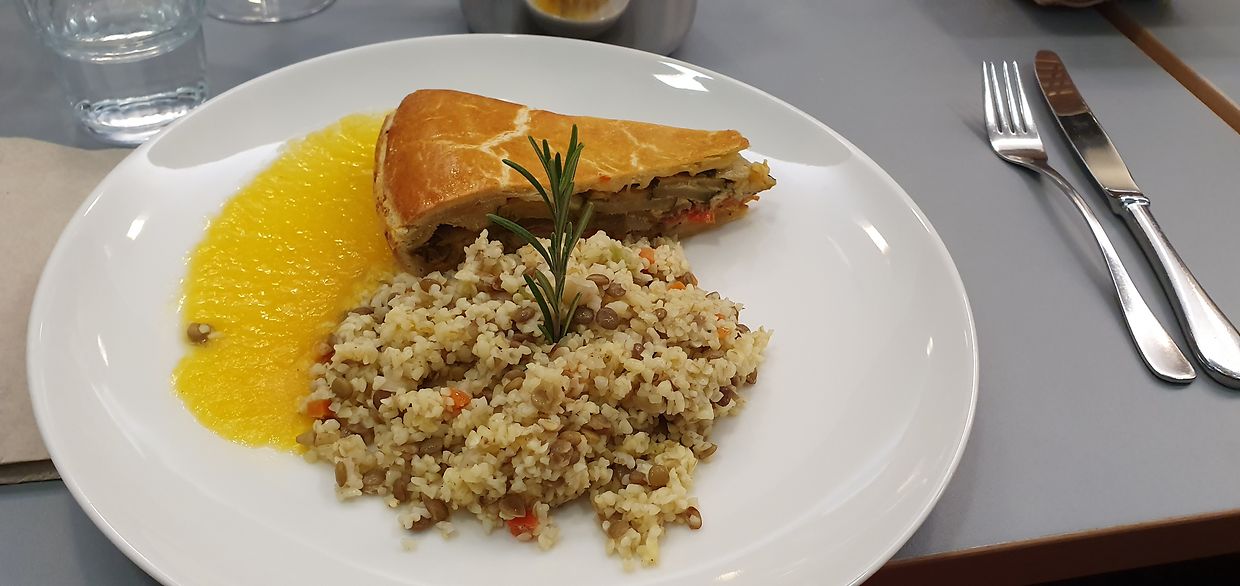 Gegen 16.30 Uhr haben die Guides Martine und Jeannot die Wandertruppe wieder sicher zur Jugendherberge geführt. Nach der Anstrengung durfte das leibliche Wohlbefinden natürlich auch nicht zu kurz kommen. So hat das Küchenteam der Jugendherberge Echternach sich nicht lumpen lassen und für die hungrigen Wanderer ein leckeres Menü zusammengestellt, welches dann in gemütlicher Runde genossen werden kann. Da man an den Weihnachstagen ja bereits viele Kalorien und häufig auch viel Fleisch zu sich genommen hat, hat der Chefkoch den Teilnehmern ein exzellentes vegetarisches Menü aufgetischt. Als Vorspeise konnten die Teilnehmer sich über Blumenkohlcrèmesuppe mit Croûtons und Trüffelöl freuen, gefolgt von provenzialischer Pastete mit Paprikacoulis als Hauptspeise und der krönende Abschluss waren exotische Früchte an Sorbet.