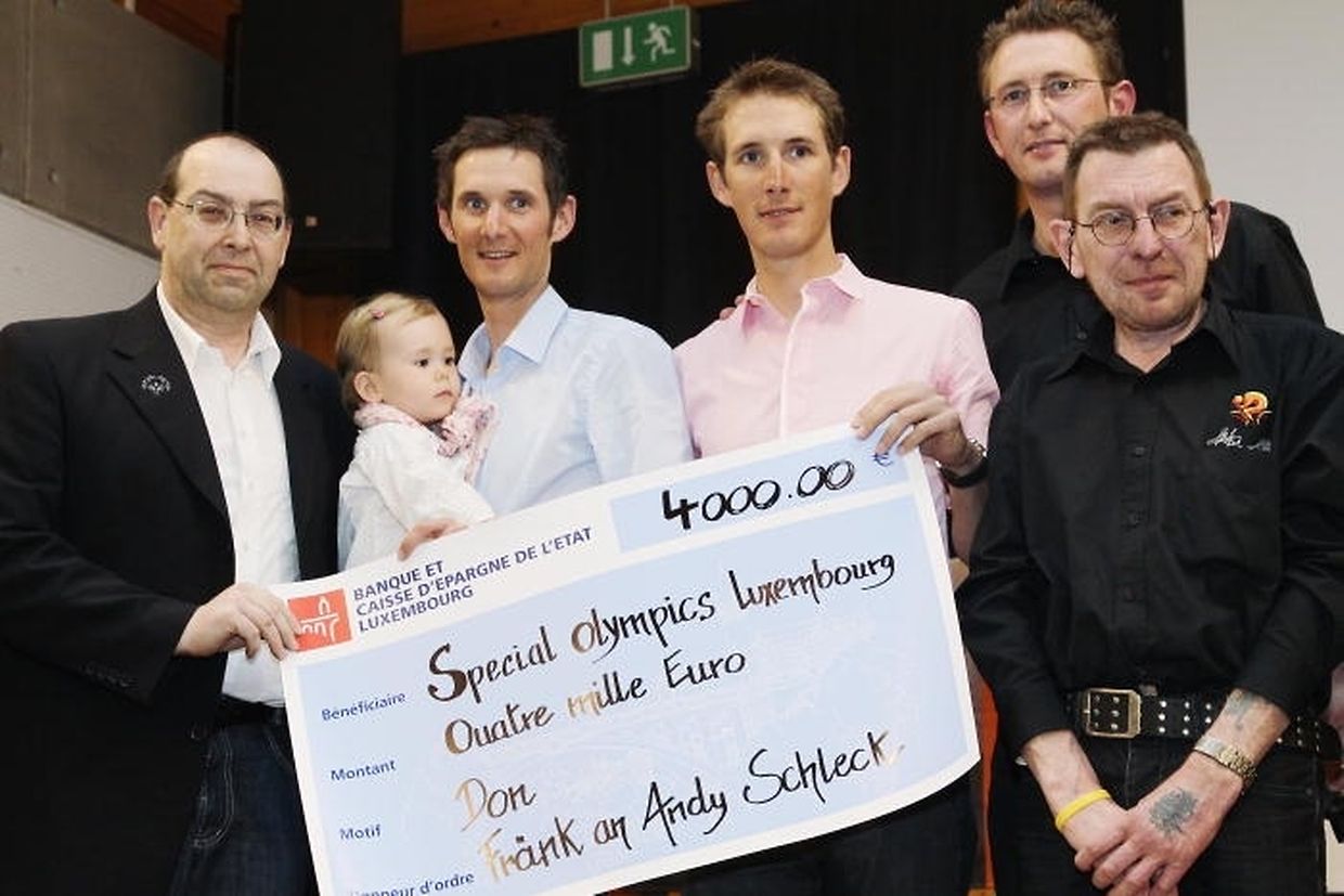 Im Namen des Fanclubs wurden Blumen an die Schleck-Familie sowie ein Scheck über 4 000 Euro an Fränk und Andy überreicht. Die beiden Brüder leiteten den Scheck an die Vertreter von „Special Olympics“, einer Sportföderation für geistig behinderte Menschen, weiter.