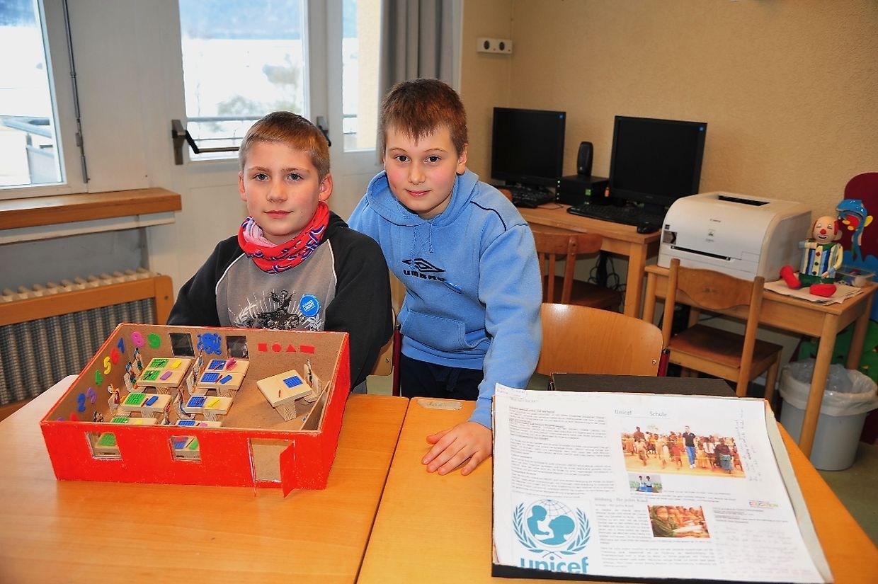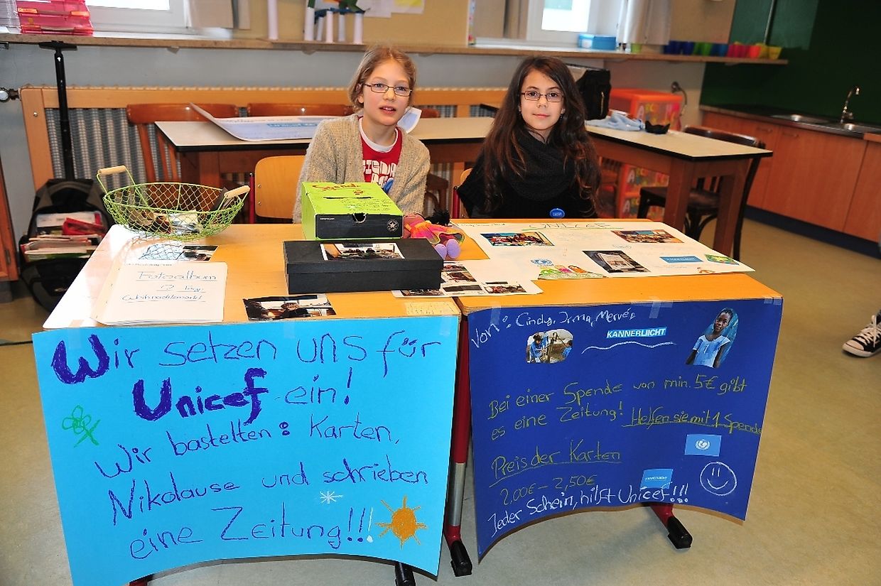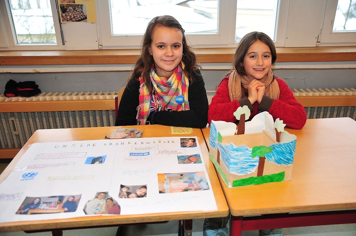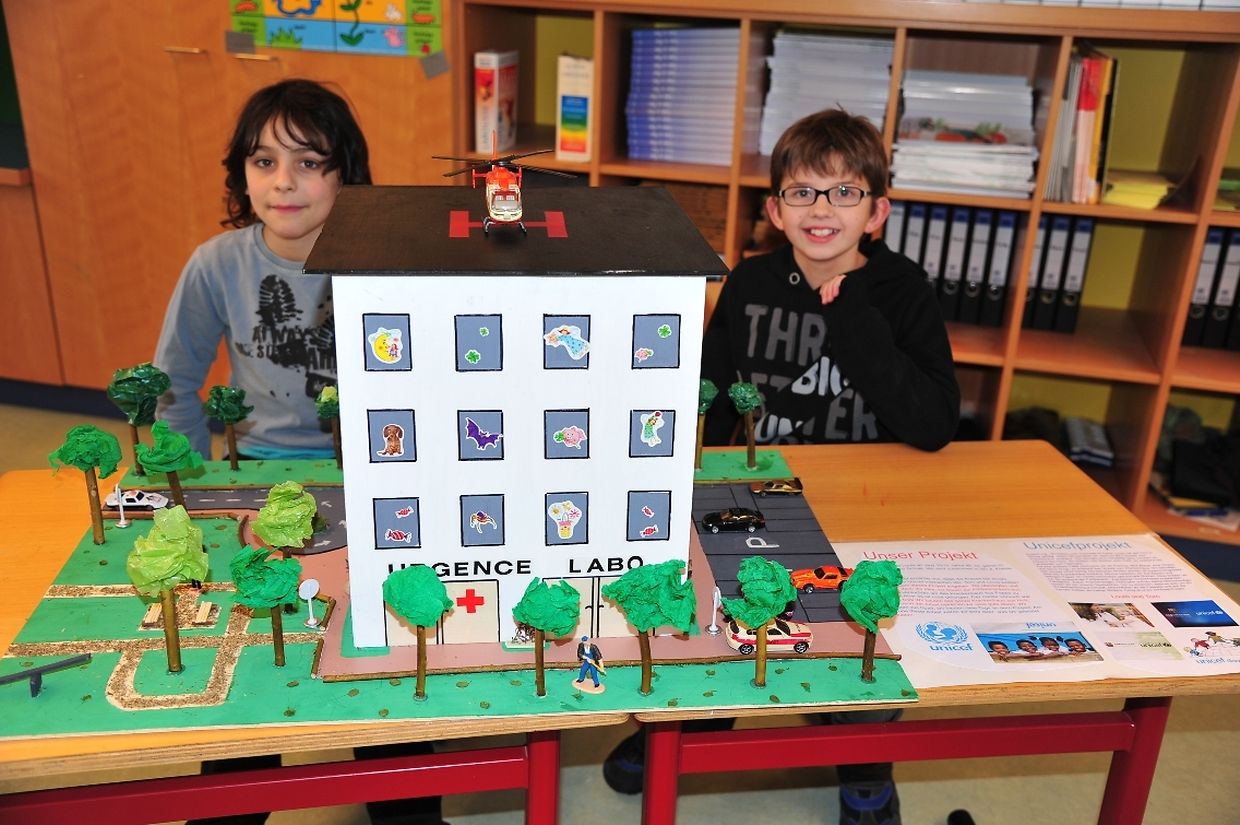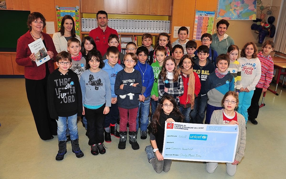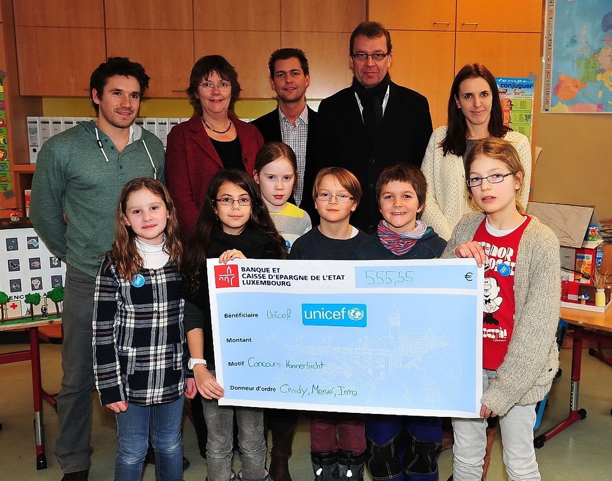 Wir setzen uns für Unicef ein ! Vielen Dank, lautete die Überschrift der kleinen Zeitung die Irma Kauten, Cindy Reuter und Mervé Ries aus der Beckericher Grundschule Zyklus 3.2 in mühseliger Feinarbeit und zahlreicher Recherchen für das Projekt „ „Kannerliicht“ von Unicef, sich für Kinder in Georgien die durch eine Behinderung benachteiligt sind, zusammensetzten. Dabei bedankten sie sich bei ihren Schulfreunden Anne, Joé und Lou für ihre wertvolle Hilfe. Mit dieser Zeitung wollten sie darauf aufmerksam machen, wie viele Mädchen sehr ungerecht behandelt werden. So beteiligten sich die Schüler während zwei Tagen am Beckericher Weihnachtsmarkt um mit dem Erlös vom Verkauf ihrer Zeitung und selbstgebastelten Weihnachtskarten sowie Spenden von Freunden, das zur Zeit von Unicef gestartete Projekt in Georgien zu unterstützen. Vor wenigen Tagen konnte der Erlös, ein Scheck über 555, 55 Euro an Isabelle Hauffels und Maryse Arendt von Unicef- Luxemburg in Gegenwart ihres Lehrpersonals in der Schule von Elvingen übergeben werden. Im Namen von Unicef bedankten sich beide Empfängerinnen für diese Spende und erklärten das von Unicef- Luxemburg unterstützte Projekt in Georgien, das vorsieht sämtlichen pflegebedürftigen und behinderten Kindern der Region Kakheti eine optimale Entwicklung und soziale Inklusion zu gewährleisten, u.a eine psychosoziale und medizinische sowie erzieherische Fürsorge anzubieten, die Ausbildung von Fachkräften bis zur Förderung von Pflegefamilien und kleinen Wohneinheiten. Bürgermeister Camille Gira und Schöffe Tim Hengen lobten die Aktion der Grundschüler mit ihrem Lehrpersonal und erklärten die finanzielle Unterstützung der Gemeinde Beckerich an diesem Projekt, sich mit einer Spende von 1444,45 Euro zu beteiligen um dann den Gesamterlös auf stolze 2 000 Euro für Unicef anzuheben. Bei dieser Gelegenheit stellten die Schüler ihre Bastelarbeiten mit den Themen Wasser, Gesundheit Schule, Krankenhäusern und Kinderkliniken auch noch kurz vor. ( CR ) ( FOTOS: CHARLES REISER)