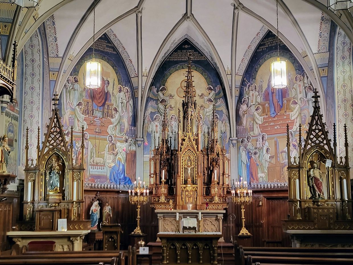 Paul Toschi, historien et guide d'églises, fait visiter l'église du XIXe siècle, qui est entièrement peinte. La peinture d'Art nouveau s'adapte comme un gant souple aux murs, au plafong et aux niches et représente des scènes bibliques et des saints. Les symboles et les ornements intercalés font en sorte qu'aucun endroit ne reste vide. Toschi présentera tout particulièrement la signification des symboles et des plantes représentés.