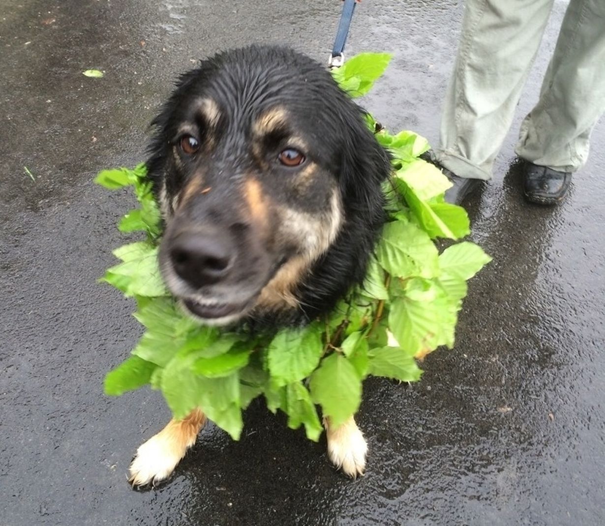 Ist das Wetter schlecht, nennen wir es Hundewetter. Von diesem Spruch jedoch ließen viele Leute sich nicht abhalten, trotz mäßigen Wetters, in den Wald zu gehen und traditionsgemäß einen Maikranz zu flechten. Auch "Jeanny" aus Elvingen war dieses Jahr mit von der Partie und sieht doch sichtlich zufrieden aus.