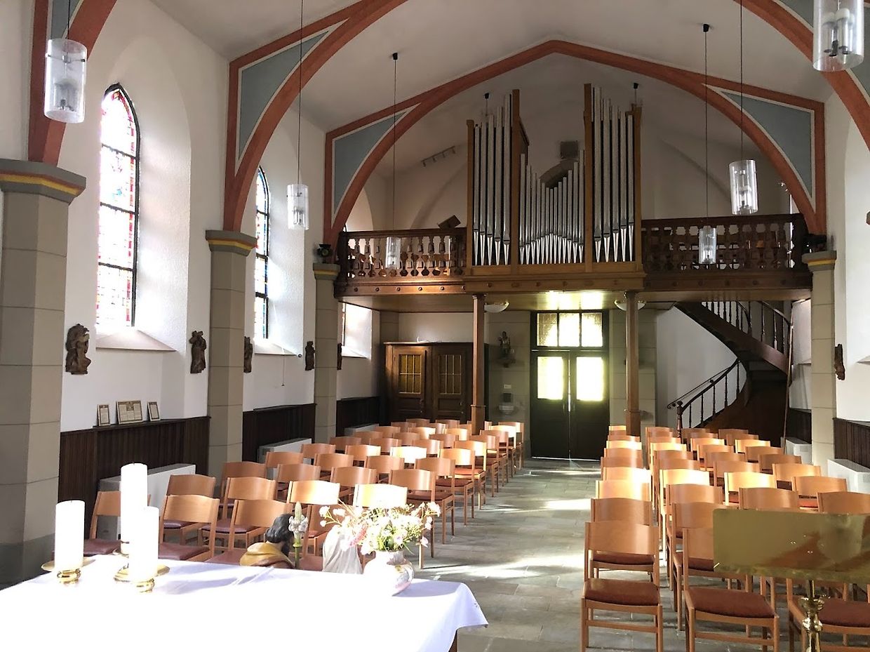 Um dem Organisten die Möglichkeit zu geben, über die Orgel den Altar sehen zu können, wurde ein Podium geschaffen, welches als Gebläsekammer dient.