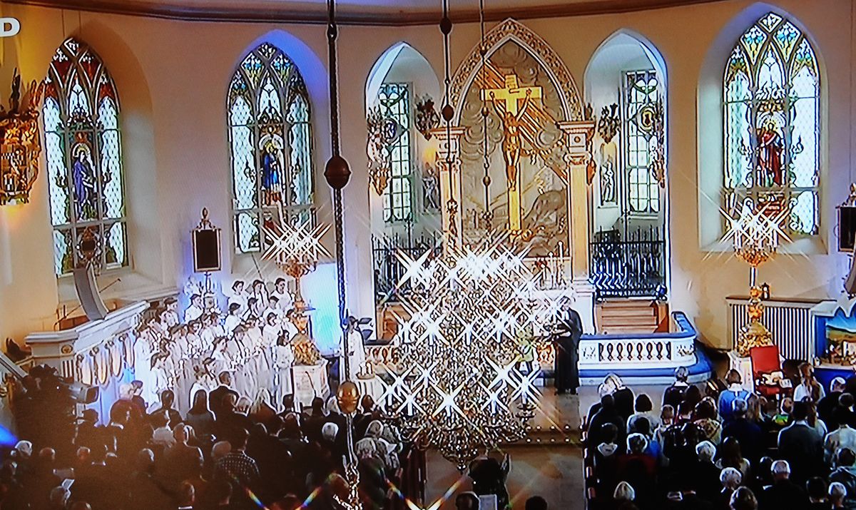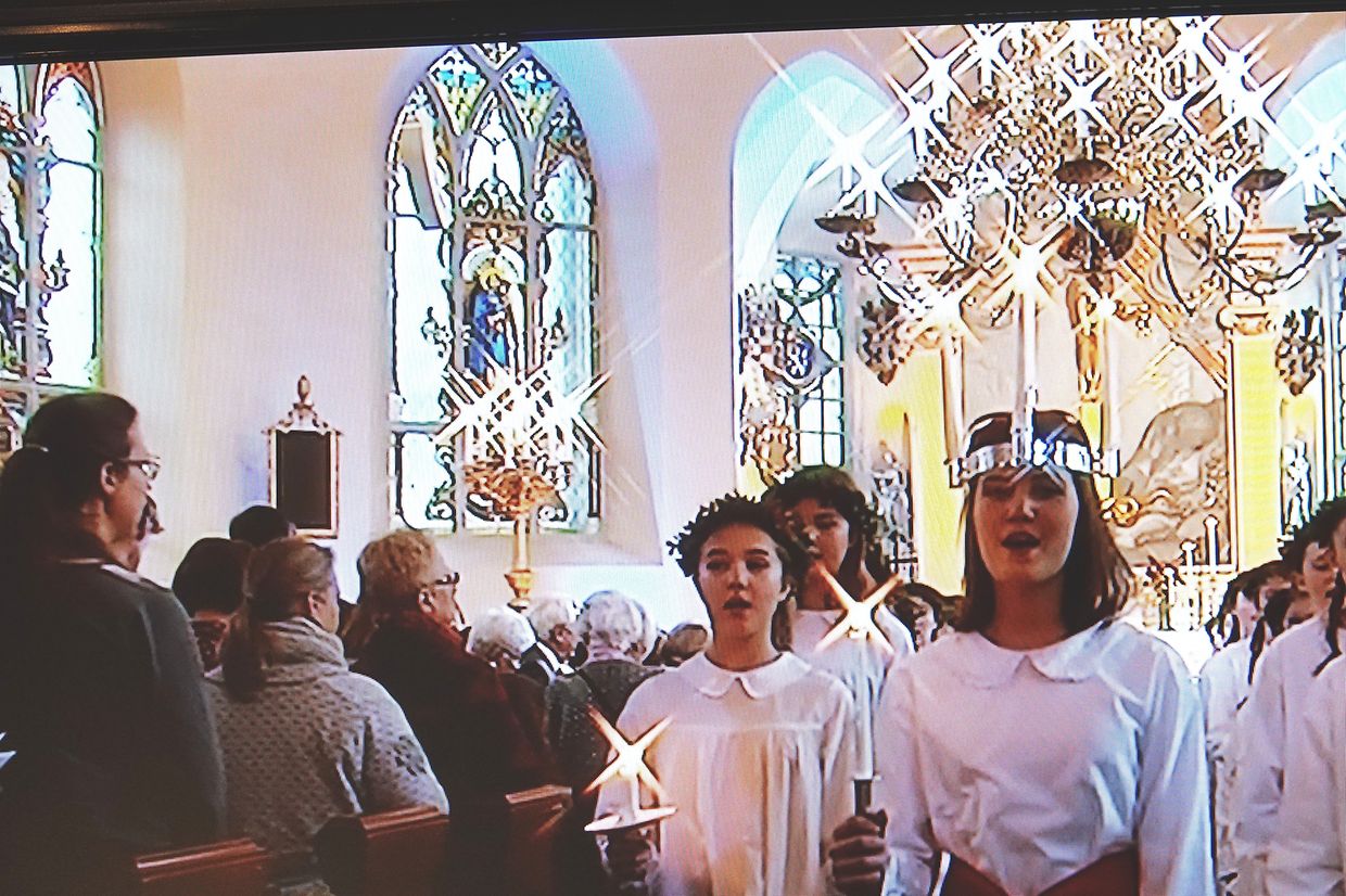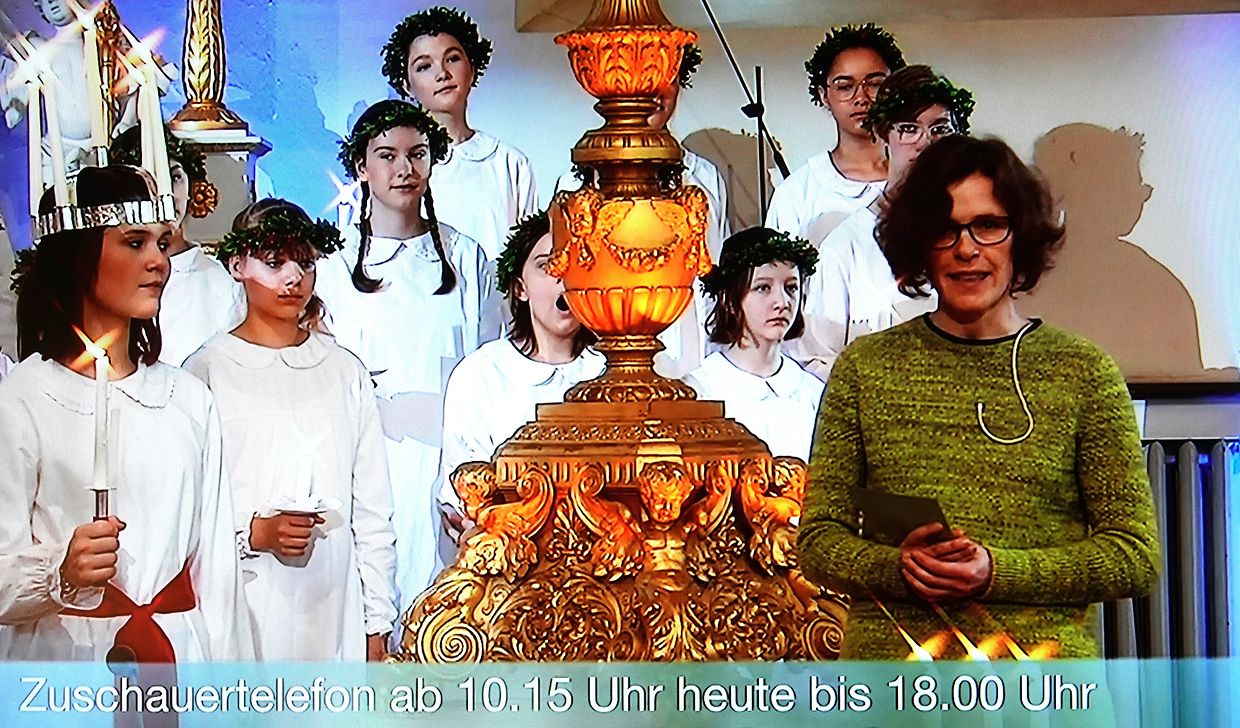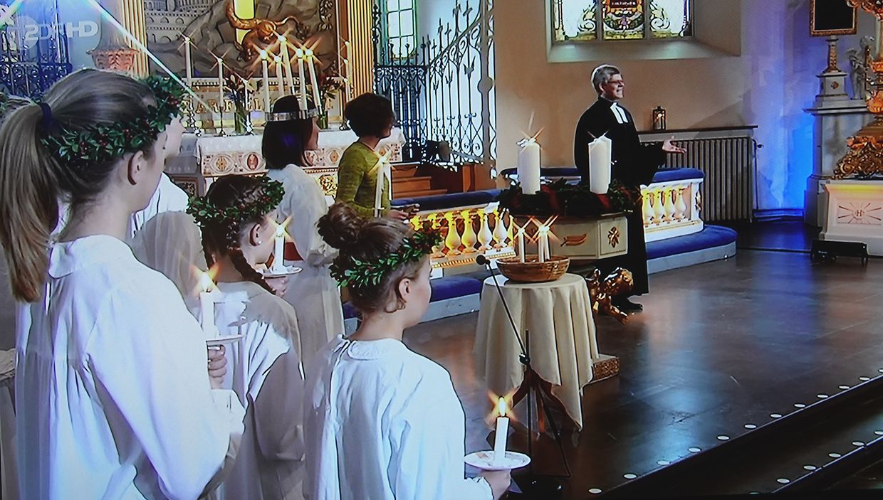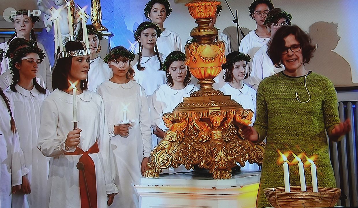 Die nächste halbe Stunde auf dem Bildschirm wird zum Lichtbrunnen. Heute wird ein evangelischer Gottesdienst aus Göteborg übertragen, von dem ich Fotos gemacht habe: In dieser schwedischen Großstadt wohnen viele Deutsche. Man trifft sich in einem evangelischen Gotteshaus. Diese Kirche ist der heiligen Lucia geweiht, welche um 286 in Syrakus (heute Siracusa) auf Sizilien als Tochter eines reichen Kaufmannes auf die Welt kam. Auf Grund eines Gelübdes widmete Lucia ihr ganzes Vermögen den Armen. Sie wird als Märtyrerin verehrt und gehört wie Barbara und Odilia zu den Lichtheiligen im Advent. In Schweden feiert man jeden Winter das Lucia-Fest. Die weiß gekleideten Mädchen tragen auf dem Kopf einen Kerzenkranz. Ausgehend von der Bedeutung des Namens Lucia (die Leuchtende) bringt der Kerzenkranz Licht in die dunkle Winterzeit. In Göteborg dauert der Tag um diese Zeit gerademal 6 Stunden. Es ist dunkel, wenn die Kinder morgens zur Schule gehen und bereis wieder dunkel, wenn sie nach dem Unterricht nach Hause gehen.