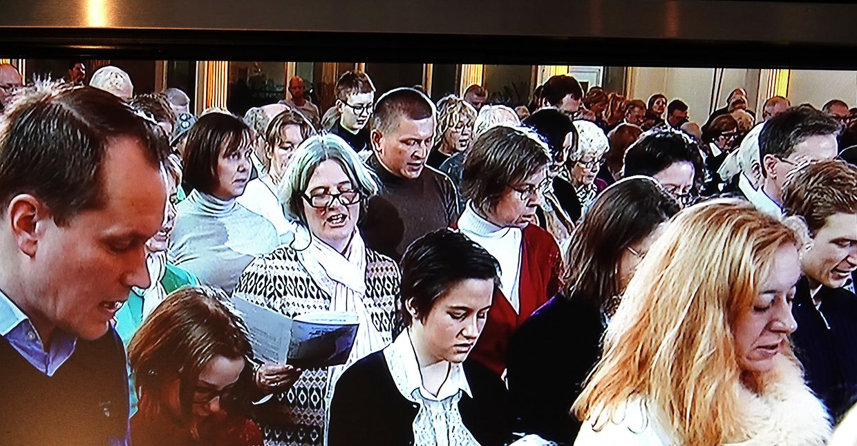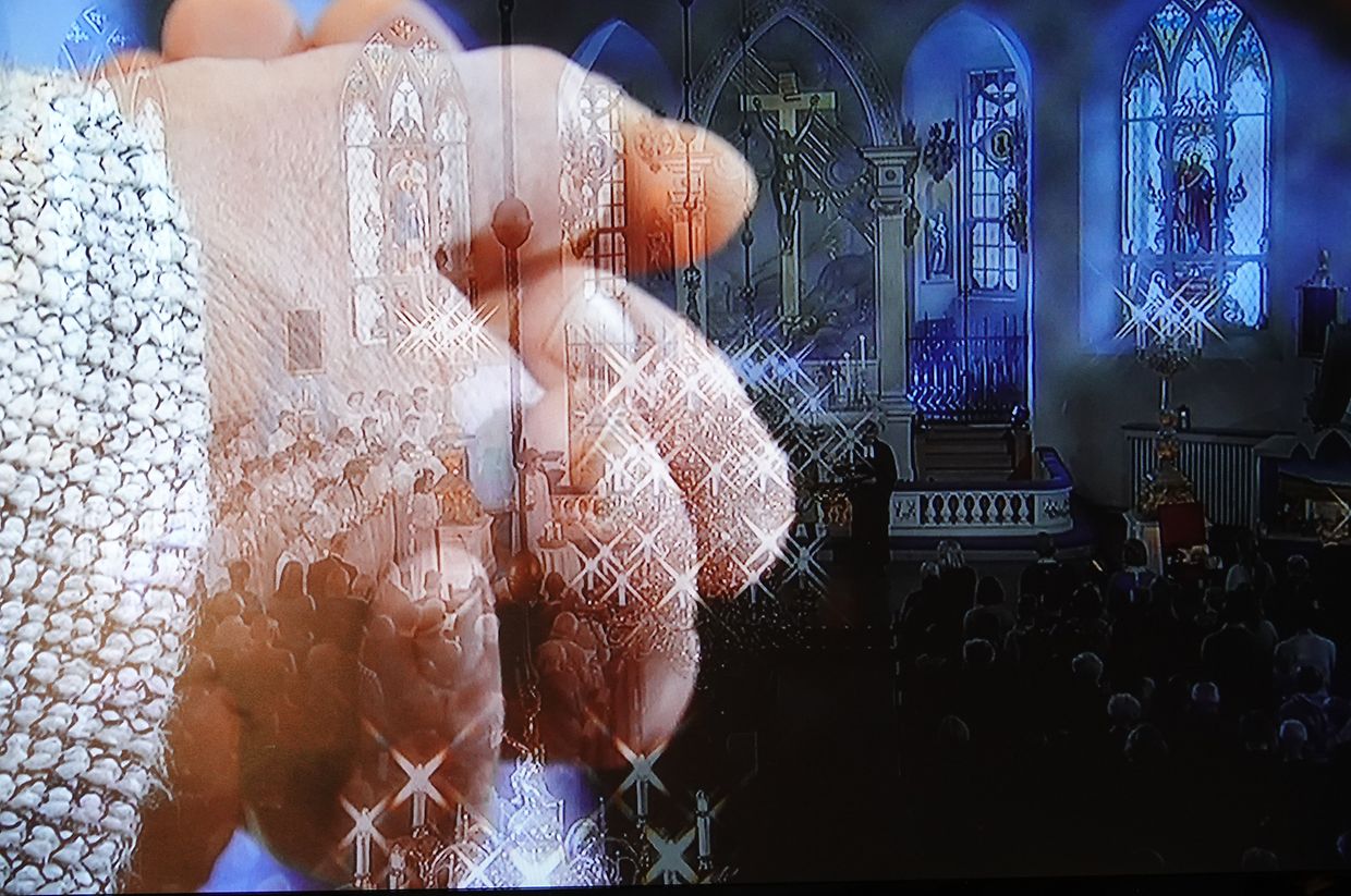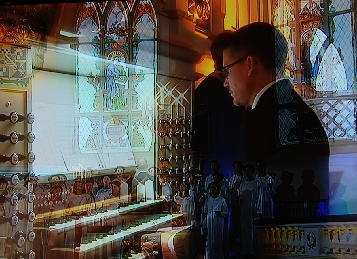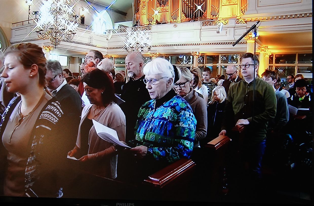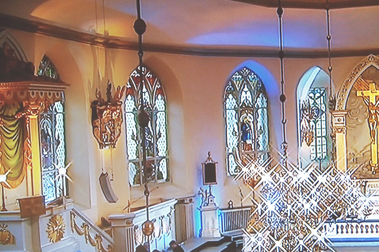 Die nächste halbe Stunde auf dem Bildschirm wird zum Lichtbrunnen. Heute wird ein evangelischer Gottesdienst aus Göteborg übertragen, von dem ich Fotos gemacht habe: In dieser schwedischen Großstadt wohnen viele Deutsche. Man trifft sich in einem evangelischen Gotteshaus. Diese Kirche ist der heiligen Lucia geweiht, welche um 286 in Syrakus (heute Siracusa) auf Sizilien als Tochter eines reichen Kaufmannes auf die Welt kam. Auf Grund eines Gelübdes widmete Lucia ihr ganzes Vermögen den Armen. Sie wird als Märtyrerin verehrt und gehört wie Barbara und Odilia zu den Lichtheiligen im Advent. In Schweden feiert man jeden Winter das Lucia-Fest. Die weiß gekleideten Mädchen tragen auf dem Kopf einen Kerzenkranz. Ausgehend von der Bedeutung des Namens Lucia (die Leuchtende) bringt der Kerzenkranz Licht in die dunkle Winterzeit. In Göteborg dauert der Tag um diese Zeit gerademal 6 Stunden. Es ist dunkel, wenn die Kinder morgens zur Schule gehen und bereis wieder dunkel, wenn sie nach dem Unterricht nach Hause gehen.