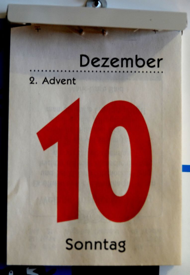 Sonntag, 10. Dezember 2017: 2. Advent. Zum Besuch der Messe in Erpeldingen um 9 Uhr reicht es nicht mehr. Deshalb wird beim Frühstück in der Küche der Fernseher eingeschaltet. Um 9:25 Uhr wird sonntags im ZDF abwechselnd ein katholischer bzw. evangelischer Gottesdienst übertragen. Das ist Balsam für die Seele und spendet Kraft für die kommende Woche. Für viele Menschen, ob gläubig oder nicht, ist besonders der Kommentar des Pastors oder Priesters eine Quelle von Zuversicht und optimistischer Gemütslage angesichts der eventuell anstehenden Ängste, Prüfungen und Zweifel. Im Dezember sind die Tage bekanntlich kurz, der Tag rückt gnadenlos nahe an die Nacht heran und die Dunkelheit erscheint endlos lang. Ein Trost: heute brennt die zweite Kerze auf dem Adventskranz. In den Ortschaften und vor den Häusern brennen Tausende von Lichtern, welche etwas Licht ins Dunkel bringen sollen. Ein schwacher Trost für alte, alleinstehende, mittellose, wohnungslose, heimatlose Menschen am Rande unserer Wohlstandsgesellschaft. Körperliche Behinderung oder altersbedingte Gebrechlichkeit schließen einen aufwärmenden Besuch auf einem Weihnachtsmarkt aus - statt geselligem Zusammensein mit gutgelaunten Mitmenschen und wohligen Aufwärmens durch einen Glühwein nur Depression und Verbitterung. Auch der angekündigte massive Schneefall (Luftdruck auf dem Barometer: 967 hPa) und die weiße Pracht draußen vermögen keine echte Freude aufkommen zu lassen. Erinnerungen an früher treiben Wehmutstränen in die Augen und auf die faltendurchfurchten Wangen.