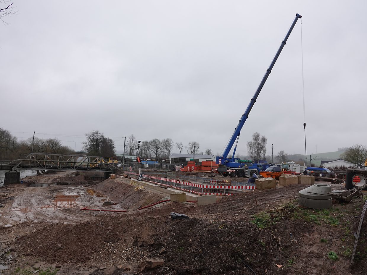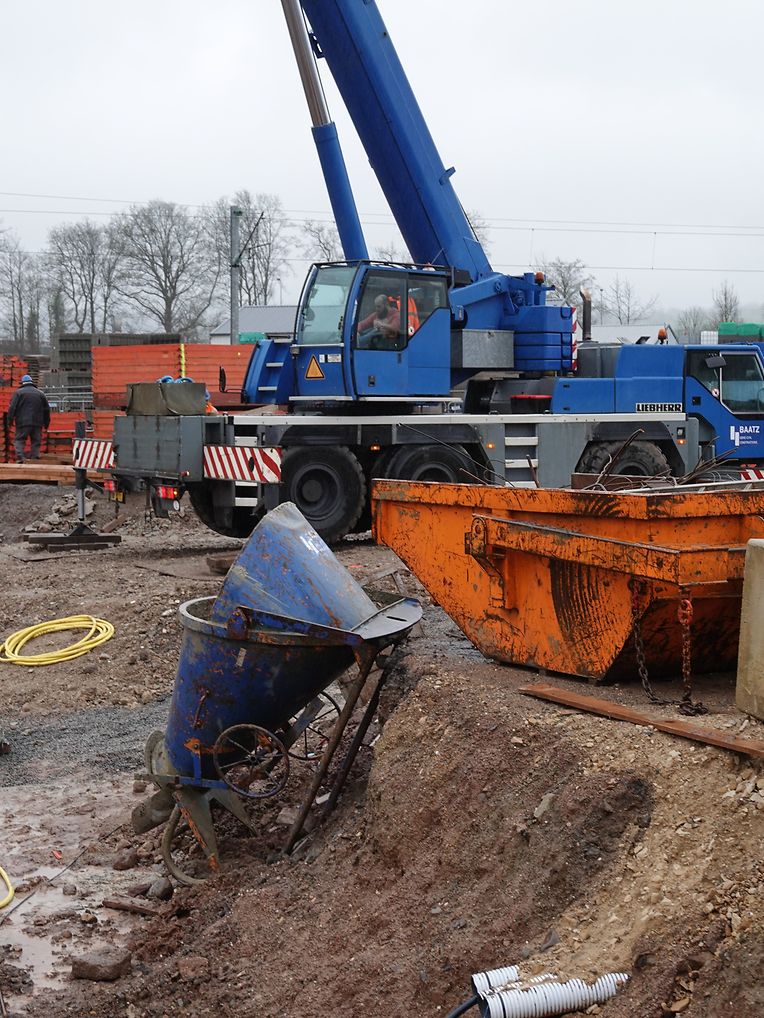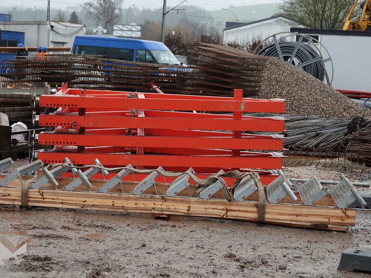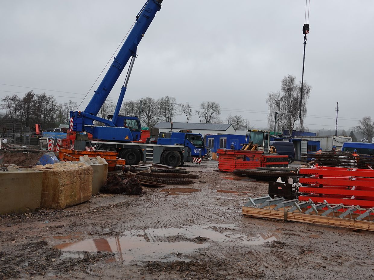 Seit Monaten wird in Erpeldingen mit Hochdruck und schwerem Gerät an der Verwirklichung eines großen Regenrückhaltebeckens unterhalb der Patton-Brücke gearbeitet. Unmengen von Boden mussten ausgehoben werden, Tonnen von Stahl und Beton wurden verarbeitet. Momentan wird an der Innenausstattung gearbeitet. Unter Aufsicht des Vorarbeiters sorgt eine kompetente, gut eingespielte Mannschaft unter schwierigen Wetterbedingungen für korrekte Ausführung der Arbeiten tief unten am Beckenboden. Der Mann im Führerstand des Teleskopkranes sorgt mit beeindruckender Präzision für Nachschub. Noch wird es Monate dauern, bis das so notwendige Rückhaltebecken operationell sein wird.