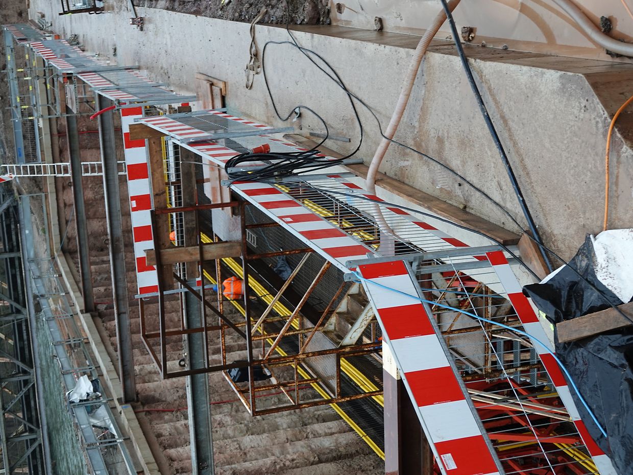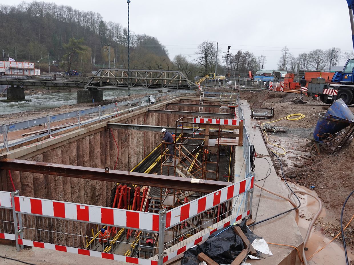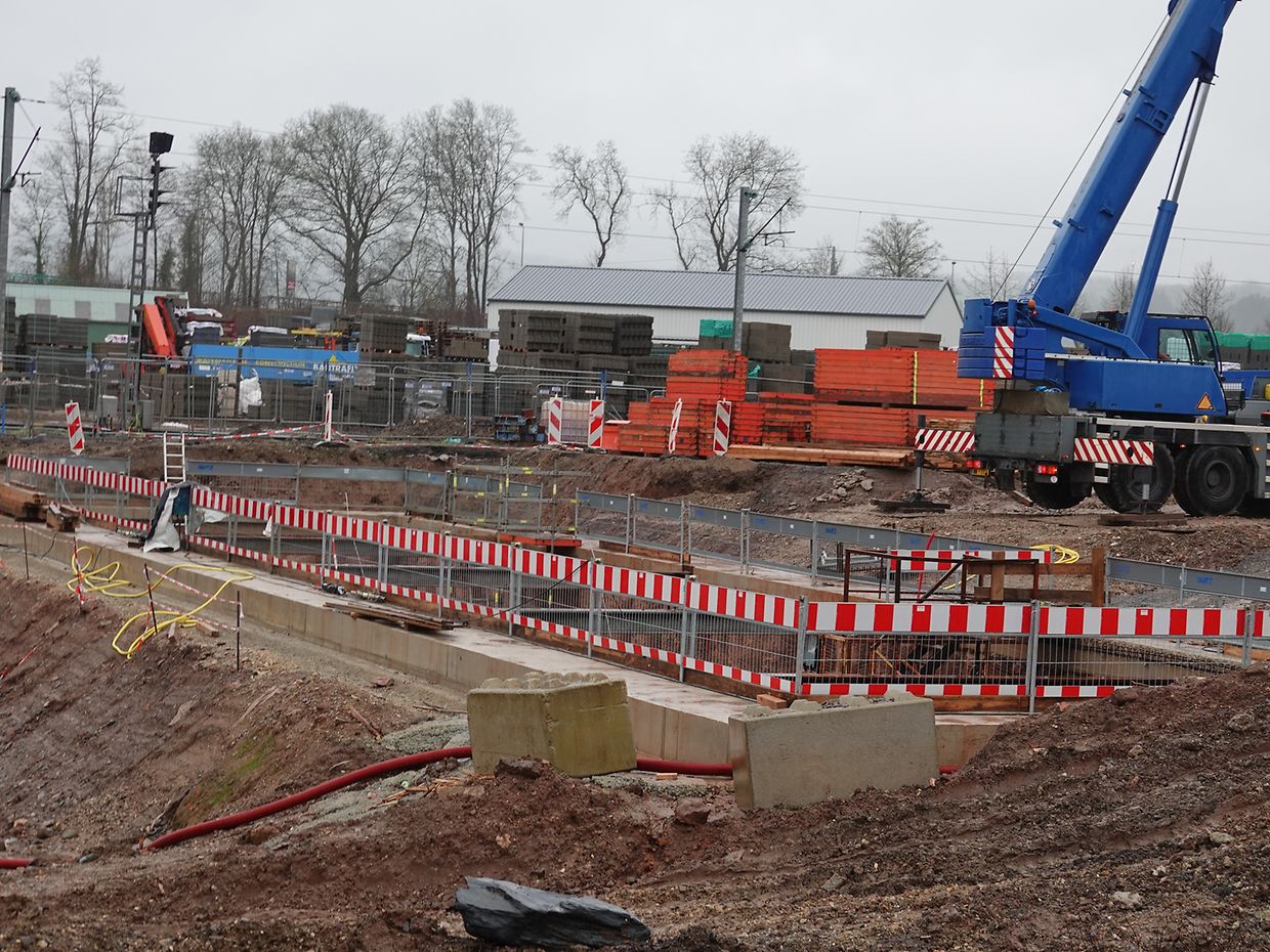 Seit Monaten wird in Erpeldingen mit Hochdruck und schwerem Gerät an der Verwirklichung eines großen Regenrückhaltebeckens unterhalb der Patton-Brücke gearbeitet. Unmengen von Boden mussten ausgehoben werden, Tonnen von Stahl und Beton wurden verarbeitet. Momentan wird an der Innenausstattung gearbeitet. Unter Aufsicht des Vorarbeiters sorgt eine kompetente, gut eingespielte Mannschaft unter schwierigen Wetterbedingungen für korrekte Ausführung der Arbeiten tief unten am Beckenboden. Der Mann im Führerstand des Teleskopkranes sorgt mit beeindruckender Präzision für Nachschub. Noch wird es Monate dauern, bis das so notwendige Rückhaltebecken operationell sein wird.