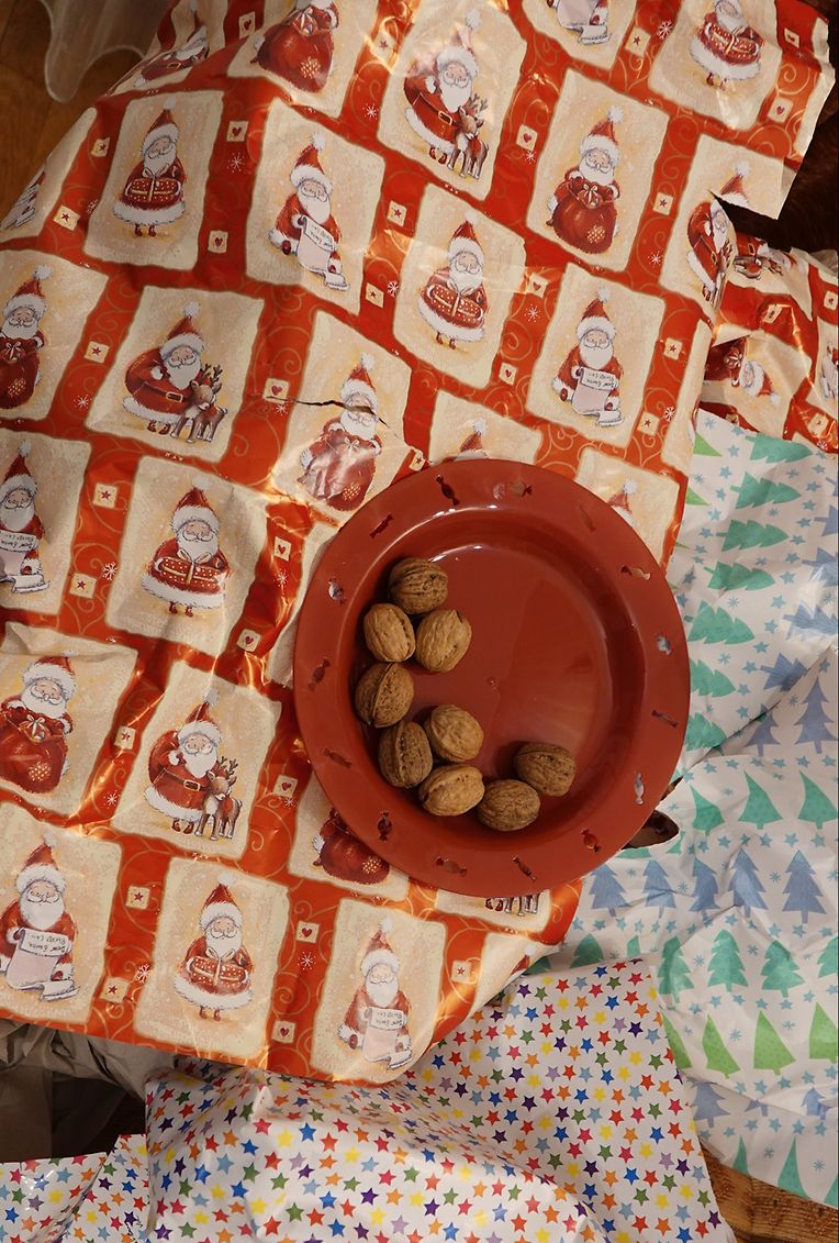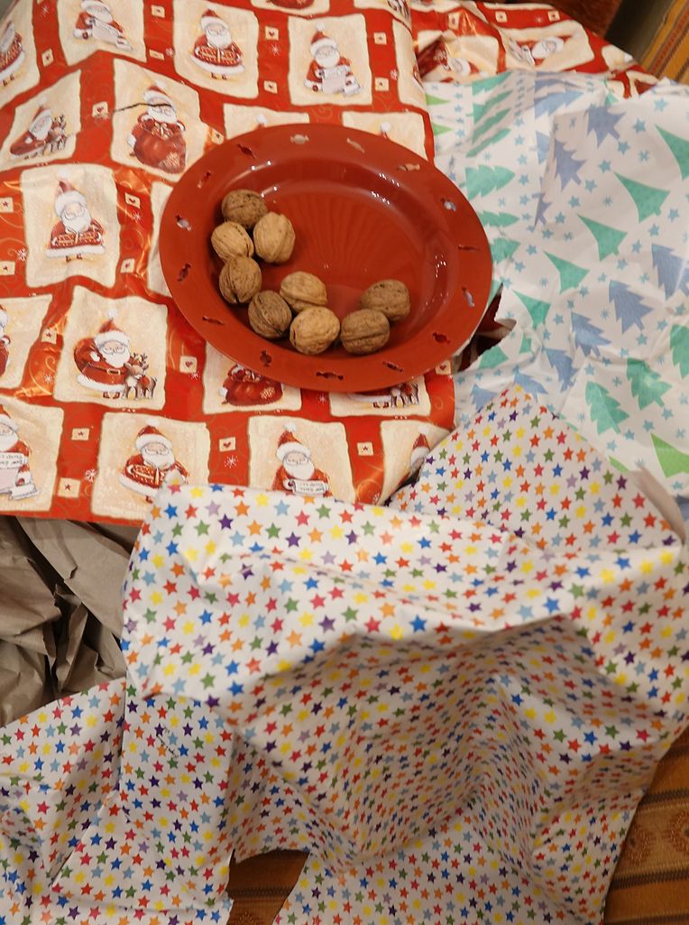 Nikloosdag ass eriwer. Mir zwee, de Vic an ëch, ware schonns vu 7 Auer unn op de Been. Merci, Kleesschen, du hues ët gudd mat eis gemengt. An der Salle à manger um Dësch louchen d'Nikloskadoën, schéi verpaakt a coolem Kadospobeier. Derniewent stongen 2 Telleren mat allerlee Séissegkeeten. Fënnef Minutte méih spéit war alles ausgepaakt. Hurra, Kleesschen! Du hues näischt vergiess. Och op den Telleren war bal alles mega lecker, déi déck Nëss hätten nit misse sinn. Déi versuerge mir bis zum Schluss. Déi halen sech laang. D'Schoklassaachen an d'Clementinen komme fir d'éischt un d'Reih. De Pobeier hu mir schéi gefaalt a mat den Nëss op d'Couche geluegt.