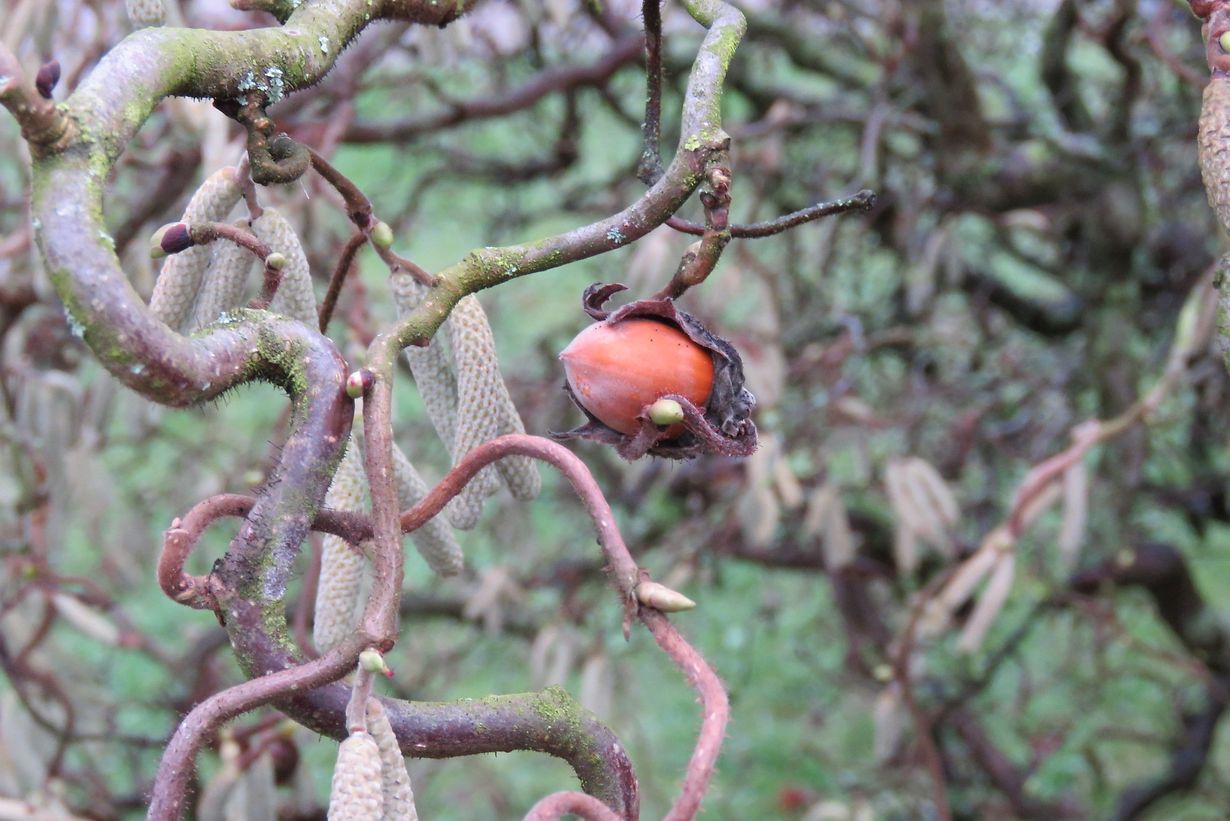 Vergessene Haselnuss allein zwischen erwachenden Kätzchen