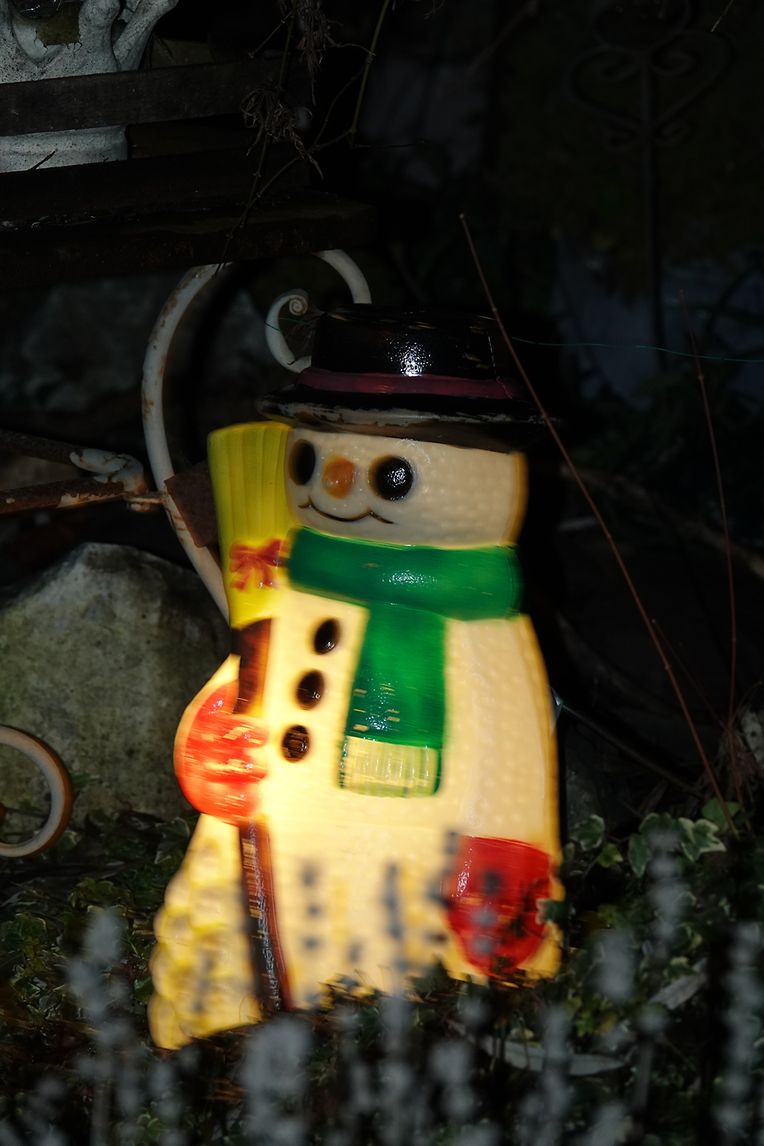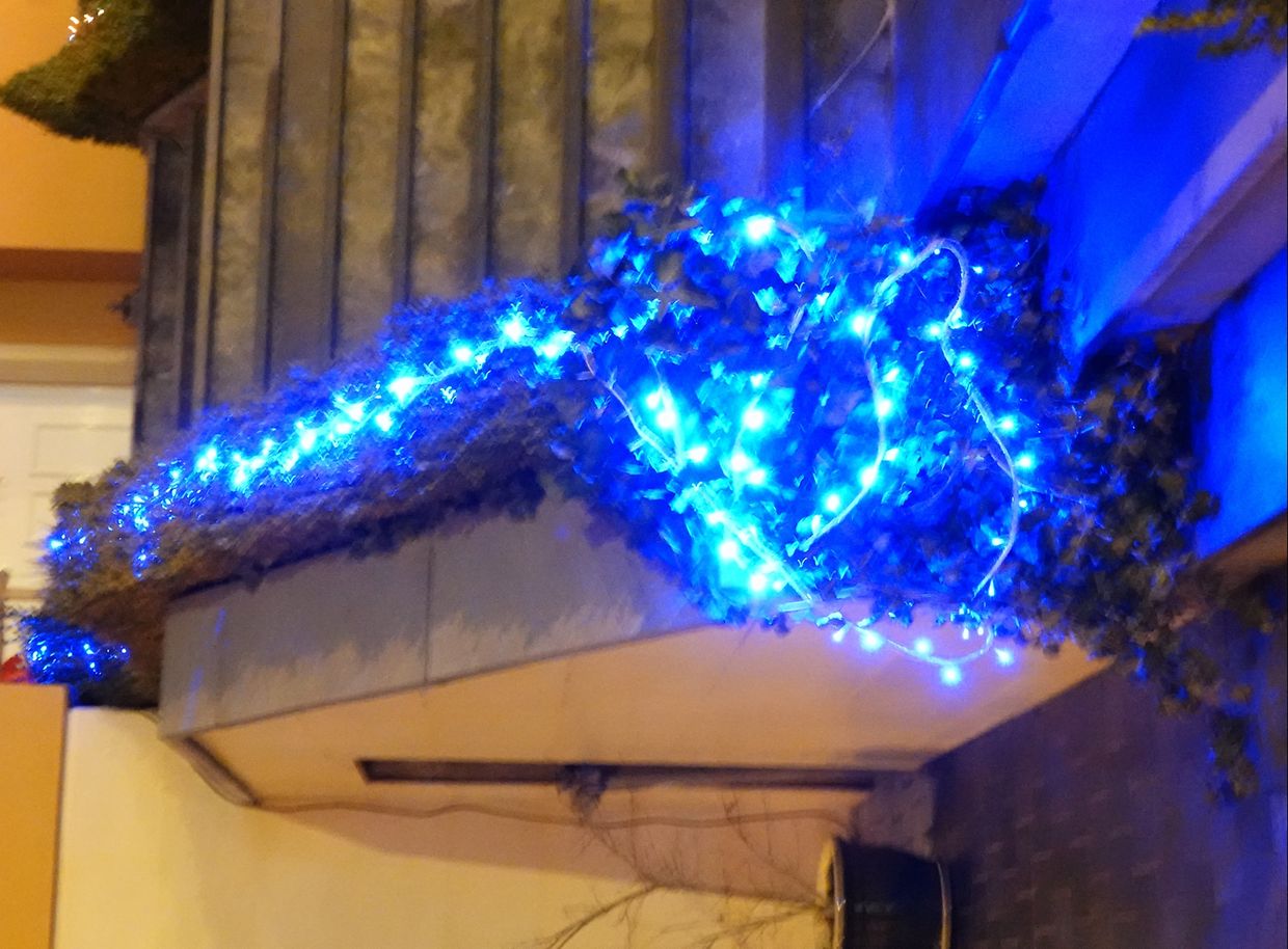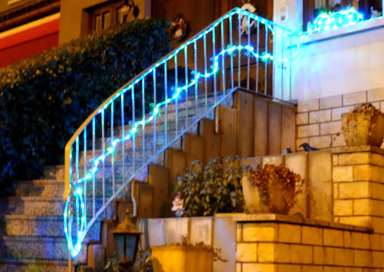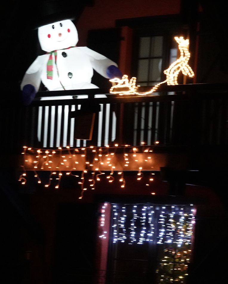 Hell strahlen allerseits Weihnachtsbeleuchtungen, mal dauernd, mal in phantasievollen Variationen und rasant schnellem Wechsel, so dass statt Fotos eher Videos zum Festhalten angebracht sind. Alles muß zur Befestigung herhalten: Hecken, Ziersträucher, ausgewachsene Bäume, Treppengeländer inklusive Handlauf, Dachrinnen, ganze Fassaden, Haustüren. Eindeutiger Trend: LED, tausendfach bei Figuren wie Sterne, Rentiere, Schlitten, Geschenkpakete, noch ab und zu ein aufgeblasener Weihnachtsmann mit üppigem Bauchumfang. Der Weihnachtsmann als Fassadenbezwinger scheint nicht mehr im Trend zu sein. Mancher mags lieber in warmem gelb oder rot, andere bevorzugen kaltes Blaulicht. Hauptsache, es leuchtet. Gemeinde und Privatleute machen großzügig mit. Allzu "aufregende" Beleuchtungen mit schnell wechselnden Effekten und Helligkeitsintensität sollten ab 22 Uhr abgschaltet werden, damit die lieben Nachbarn nicht gezwungen sind, eine dunkle Maske vor den Augen anzubringen, wenn sie ungestört schlafen wollen oder müssen.