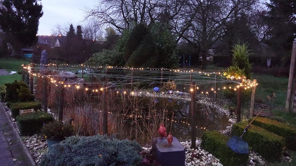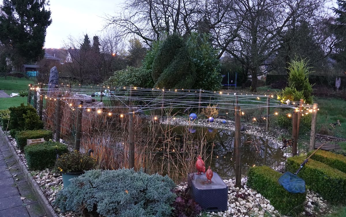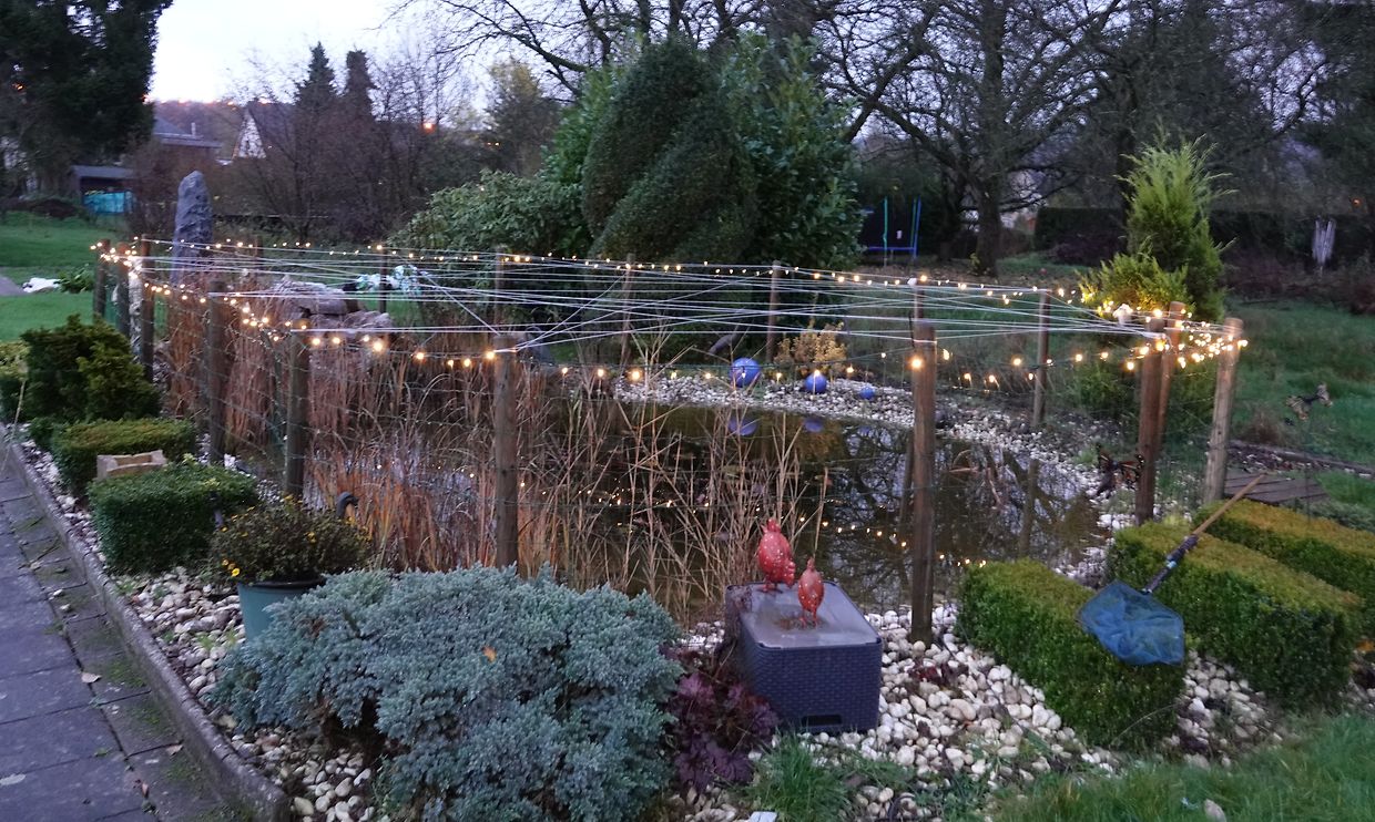 Heute blinken zum ersten Mal die vielen Lichter der langen Weihnachtsbeleuchtung, die ich genau wie letztes Jahr am Zaun um den Gartenteich befestigt habe. Wundern wird man sich darüber, dass quer über den Teich in allen Richtungen helle Schnüre gespannt sind. Die habe ich vor einigen Wochen anbringen müssen. um ungebetene Gäste, zwei ausgewachsene Fischreiher, daran zu hindern, ungeniert ihren Hunger an den Fischen zu stillen, welche ahnungslos zwischen den Seerosenblättern umherschwammen. Zum Glück hält sich die Dezimierung des Fischbestandes noch in erträglichen Grenzen.